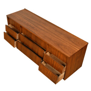 American Modernist Split + Graduated 9 Drawer 66″ Walnut Dresser – Dressed Up in Bow Ties!