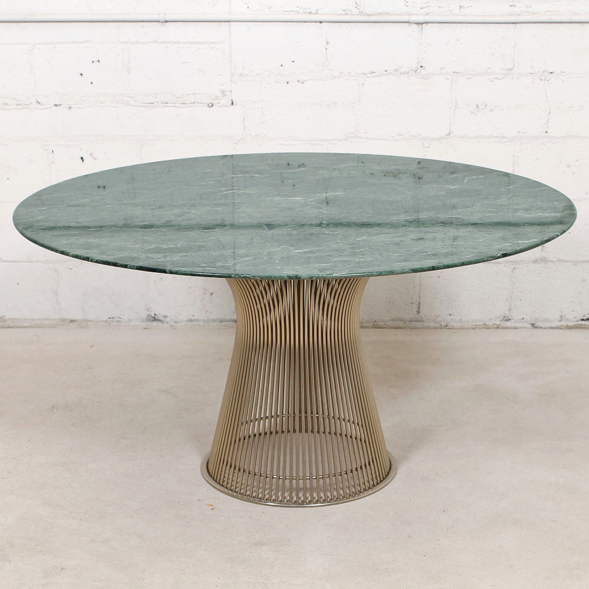 The Platner Collection of furniture is defined by the use of metal rods that are shaped to form the base of the pieces. In this table the base is nickel and has a silver tone. As stated above, the table top is green marble, Italian in origin, making it rarer and desirable.