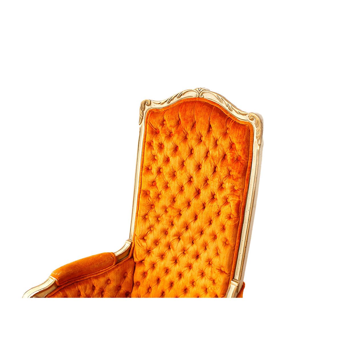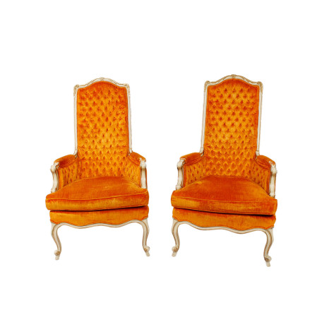 Louis XV meets Vegas! -Two French style bergeres with crushed orange velvet upholstery.