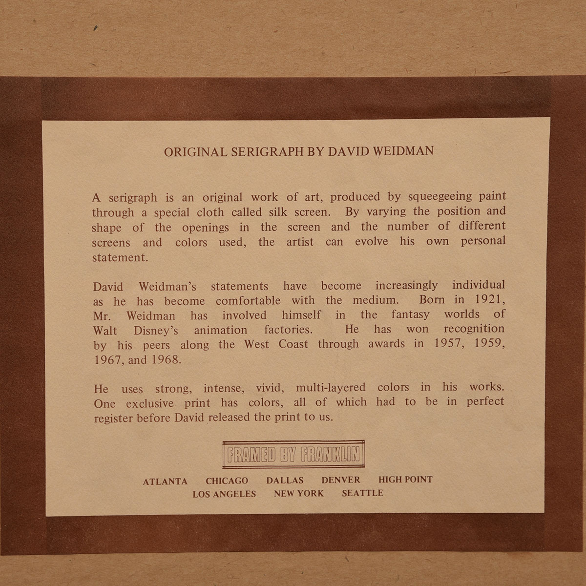 Peggy Olsen had several Weidman prints shown throughout the award-winning TV show “Mad Men”.