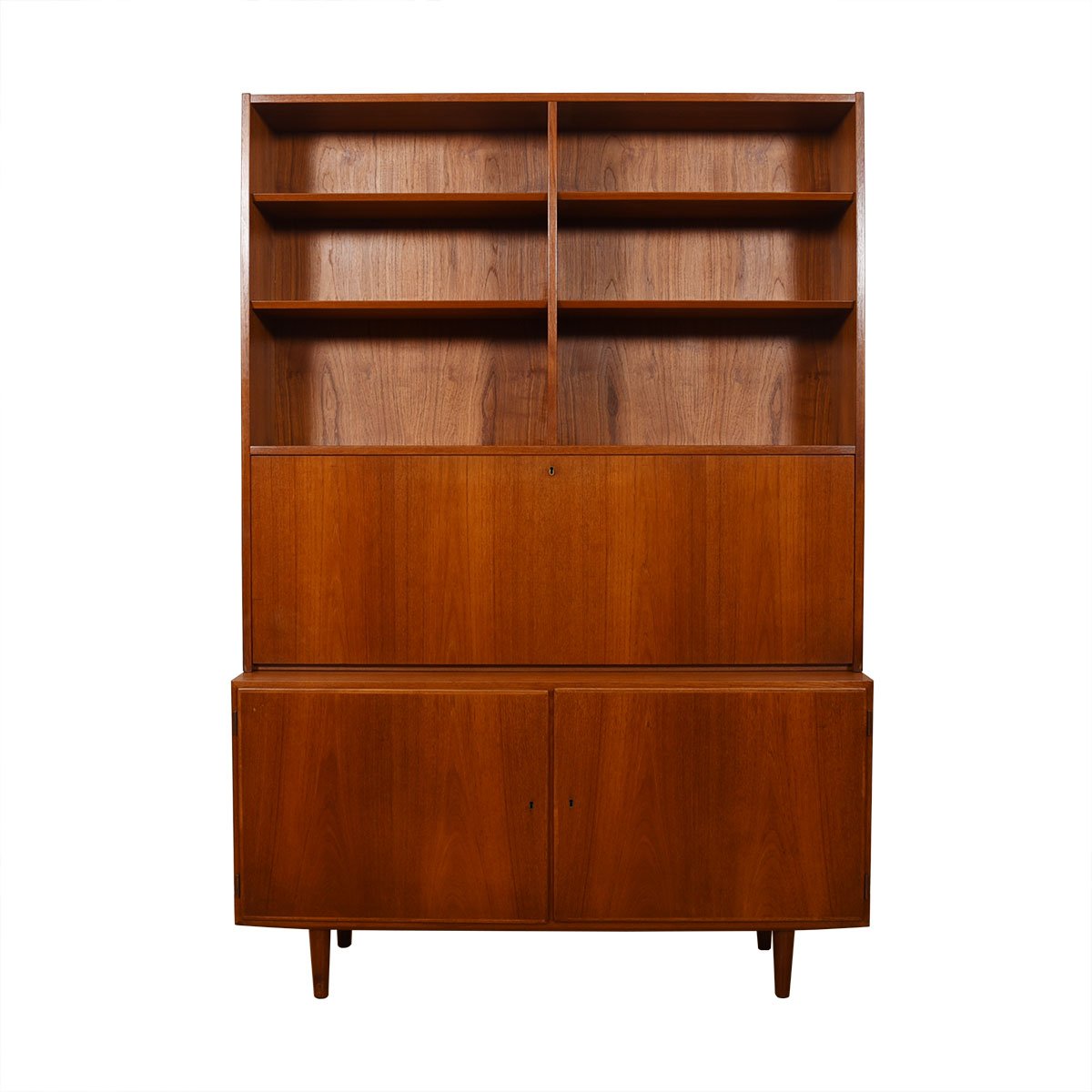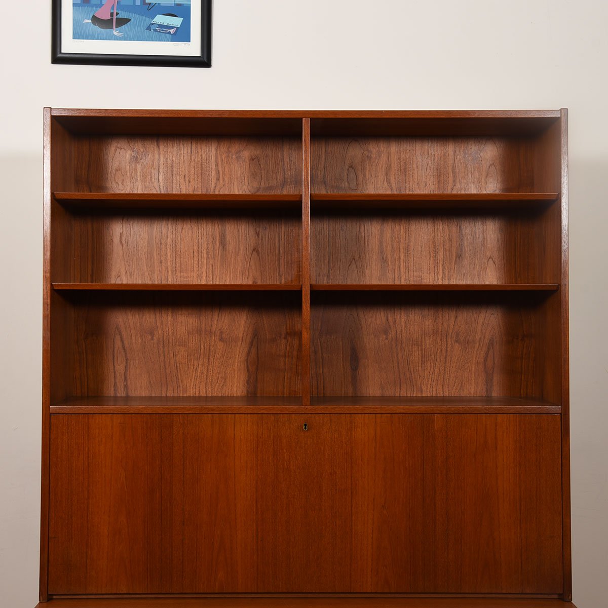 This is a 2-piece Danish Modern cabinet in teak with a multi-functional top that includes a locking drop down door, which can serve as a secretary desk or bar area. The cabinet features 3 shallow drawers on the left side and storage space with an adjustable shelf on the right. Use the shelves above the secretary for display of objects or for books. Versatile functionality in a relatively compact footprint.