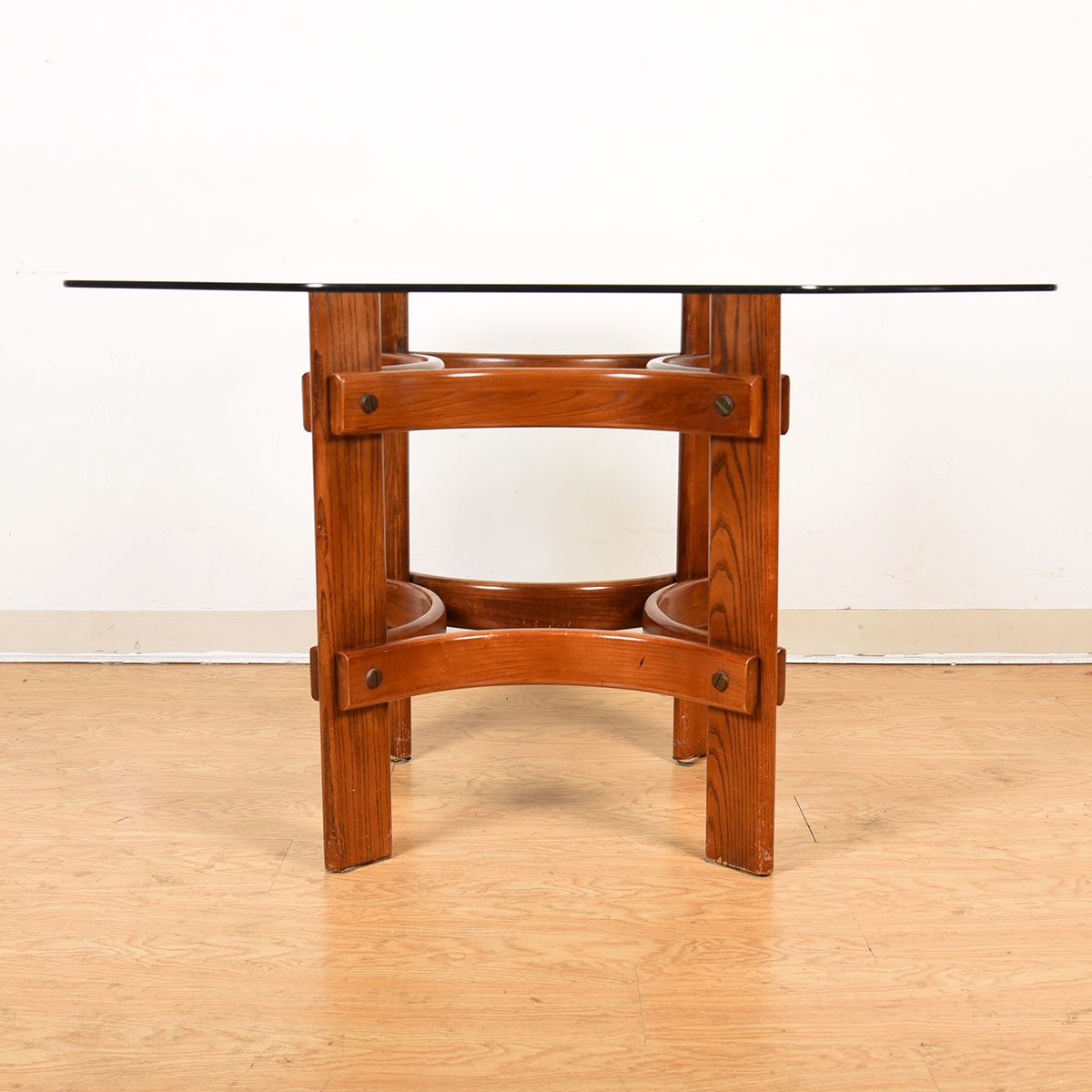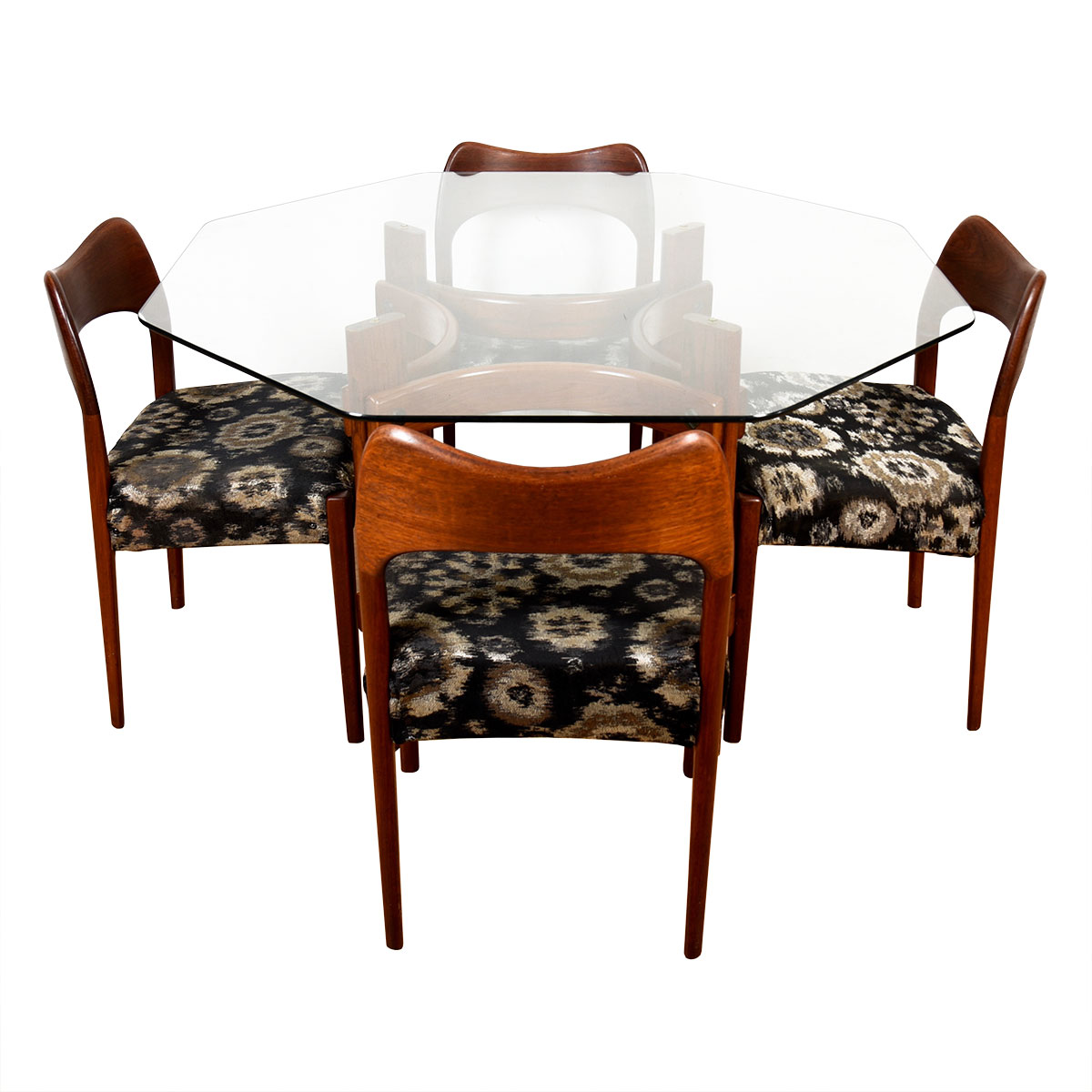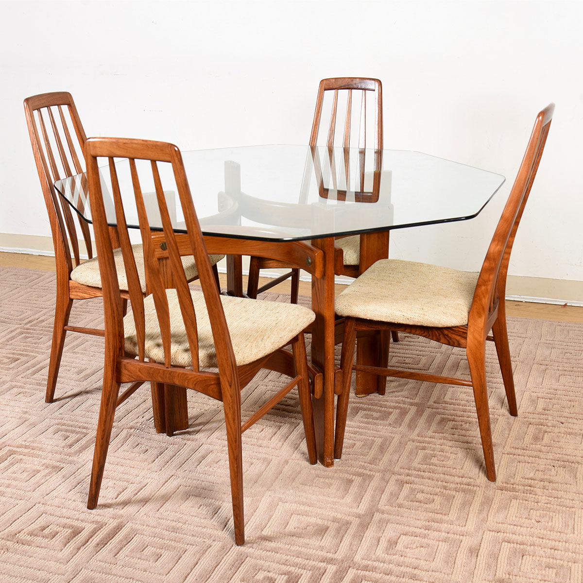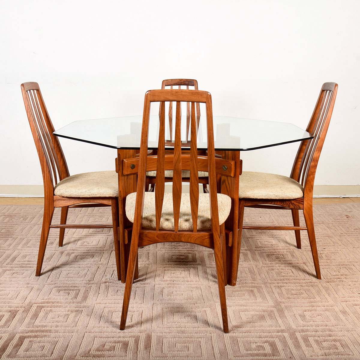 Thanks to the hexagonal glass top on this dining table, you will be able to enjoy the fascinating sculptural design in teak forming the base. The bentwood stretchers echo the unusual shape of the table top.