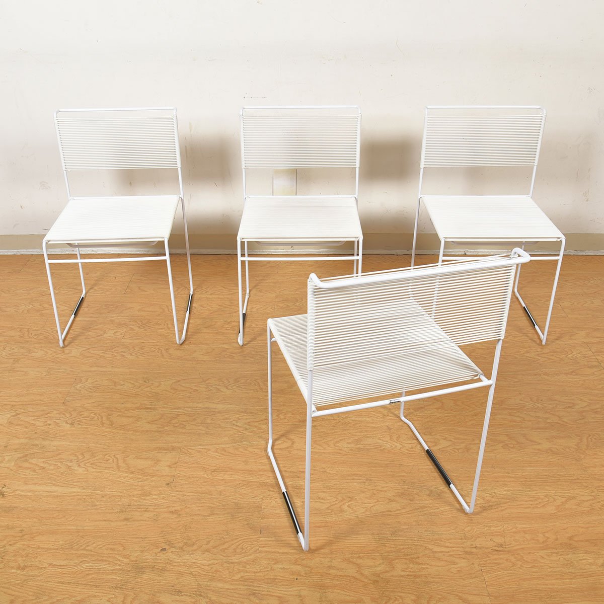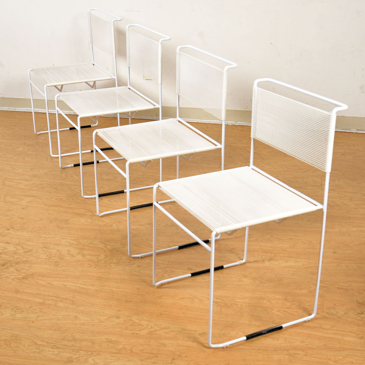 A set of four 1970s white PVC steel framed dining chairs with nylon rope woven seat and back called the Spaghetti chair designed by Giandomenico Belotti