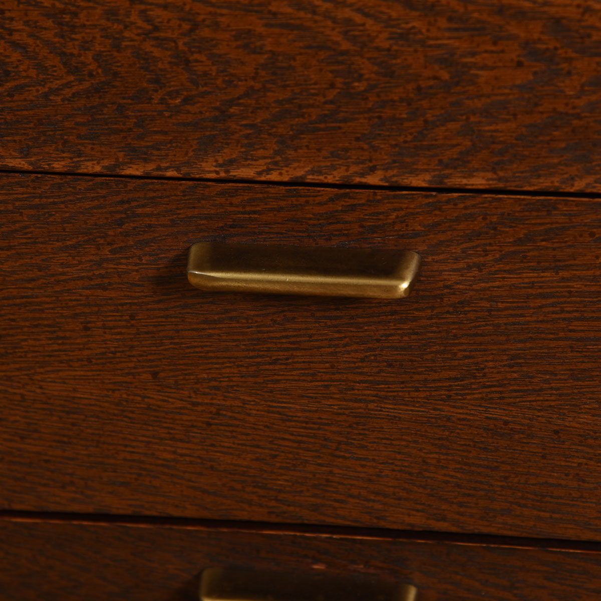 The brass handles are a classic mid century look. The piece is perfect for a work space as well as home.