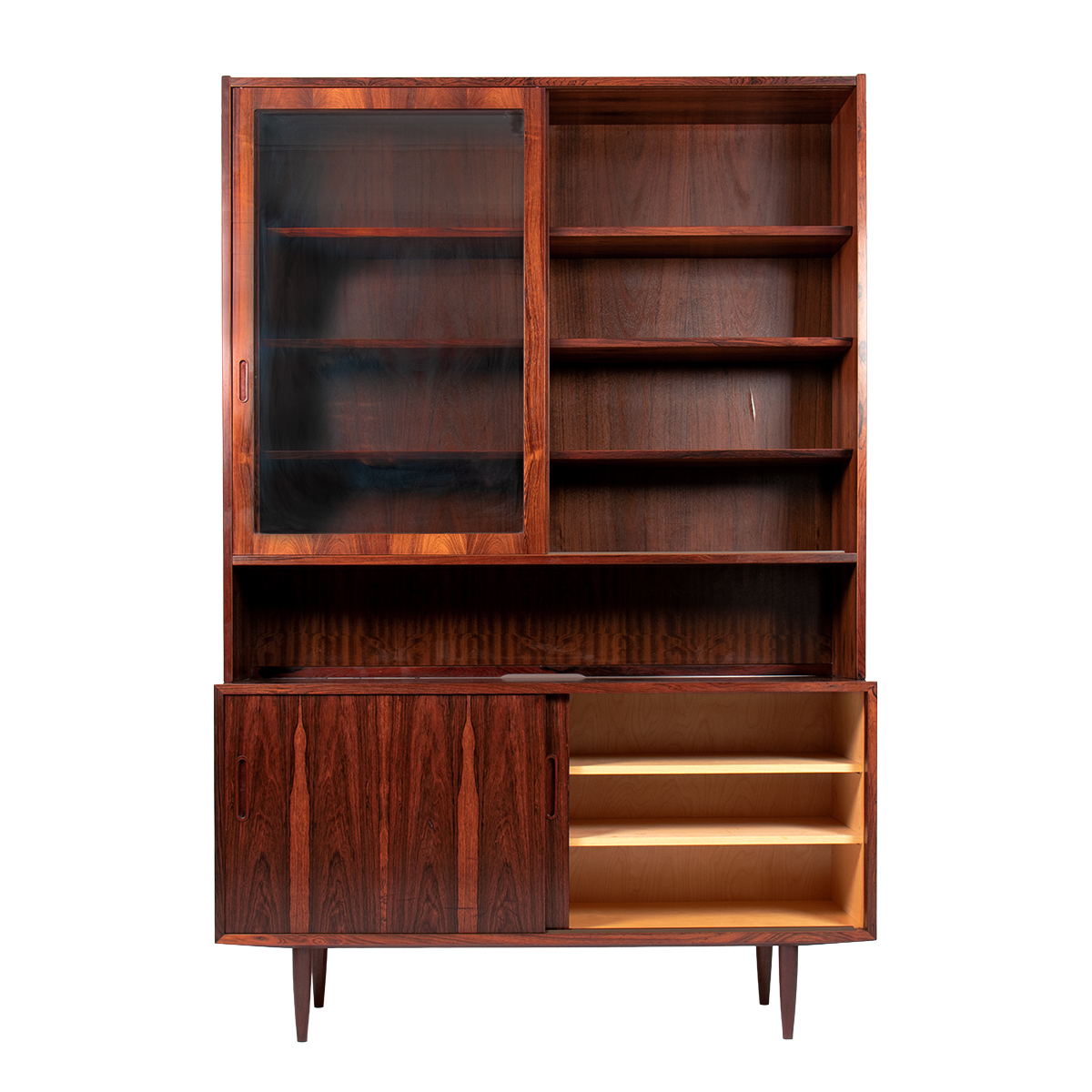 » » » 55″ 2-pc Danish Rosewood Storage | Sliding Door Cabinet w Glass Display Top