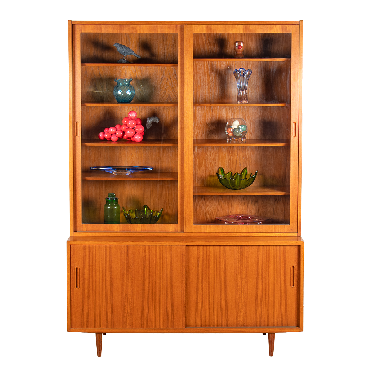Home » Shop » Storage » Bookcases / Wall Units » 55″ 2-Piece Danish Teak Glass Display Top Storage w Sliding Doors Top + Bottom