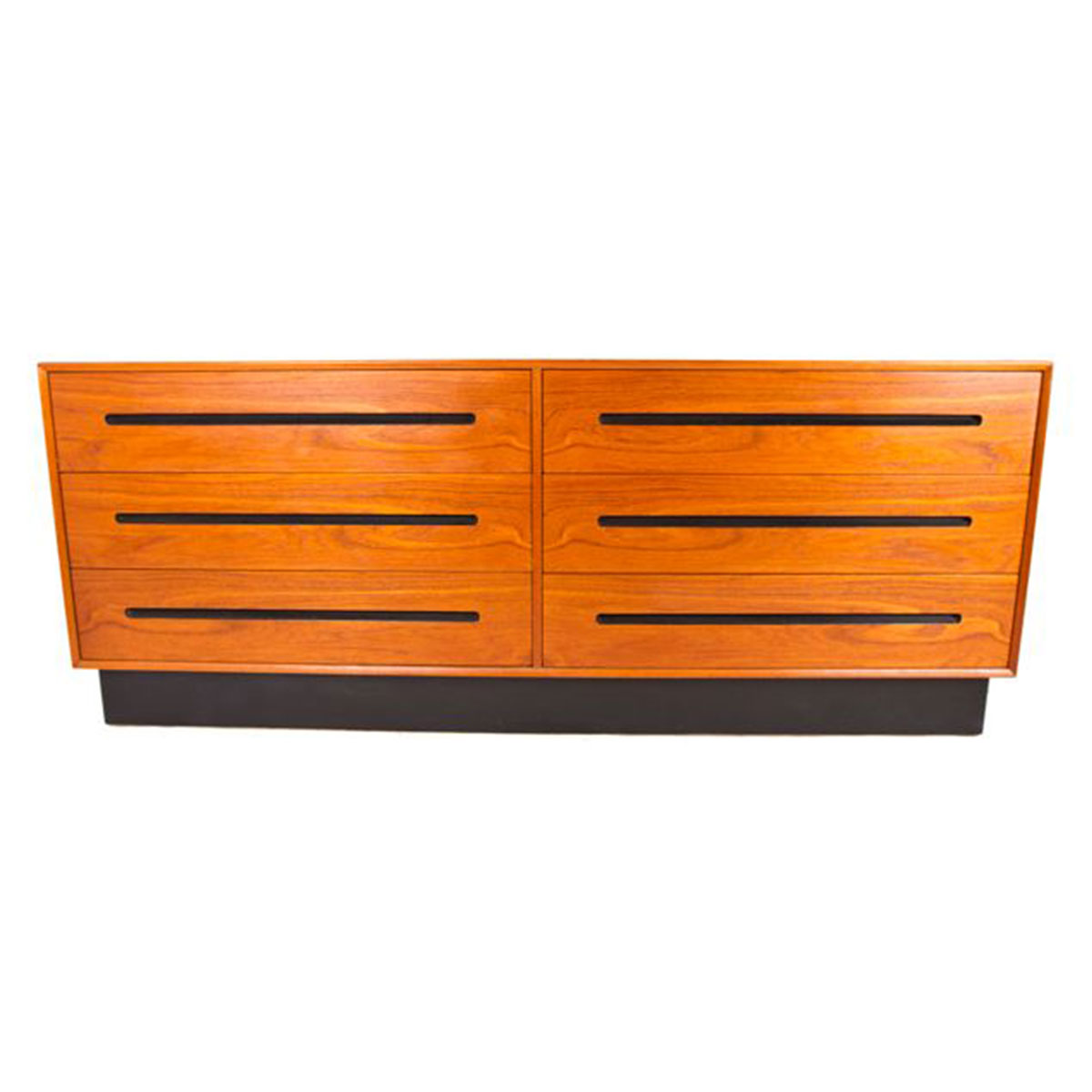 From Westnofa of Norway, Low and Wide Danish Modern Teak Dresser with 6 Drawers. This Piece has Beautiful Grain with Black Inset Drawer Pulls and a Black Base.