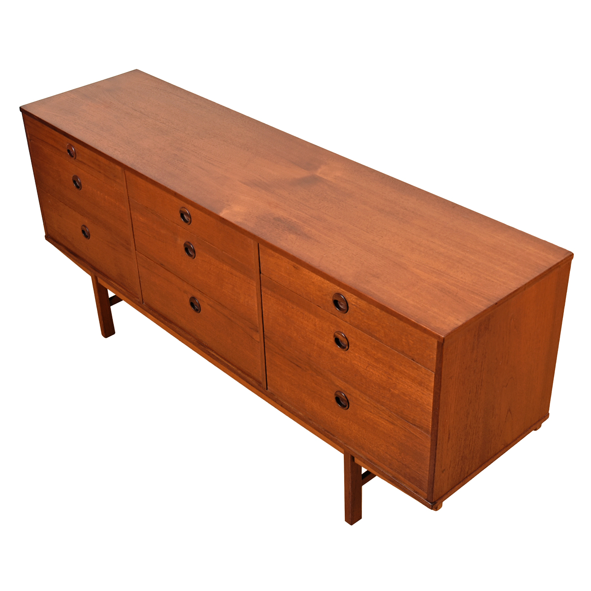 - This gorgeous dresser features a teak wood frame with clean lines and dovetailed drawers with circular, recessed pulls