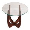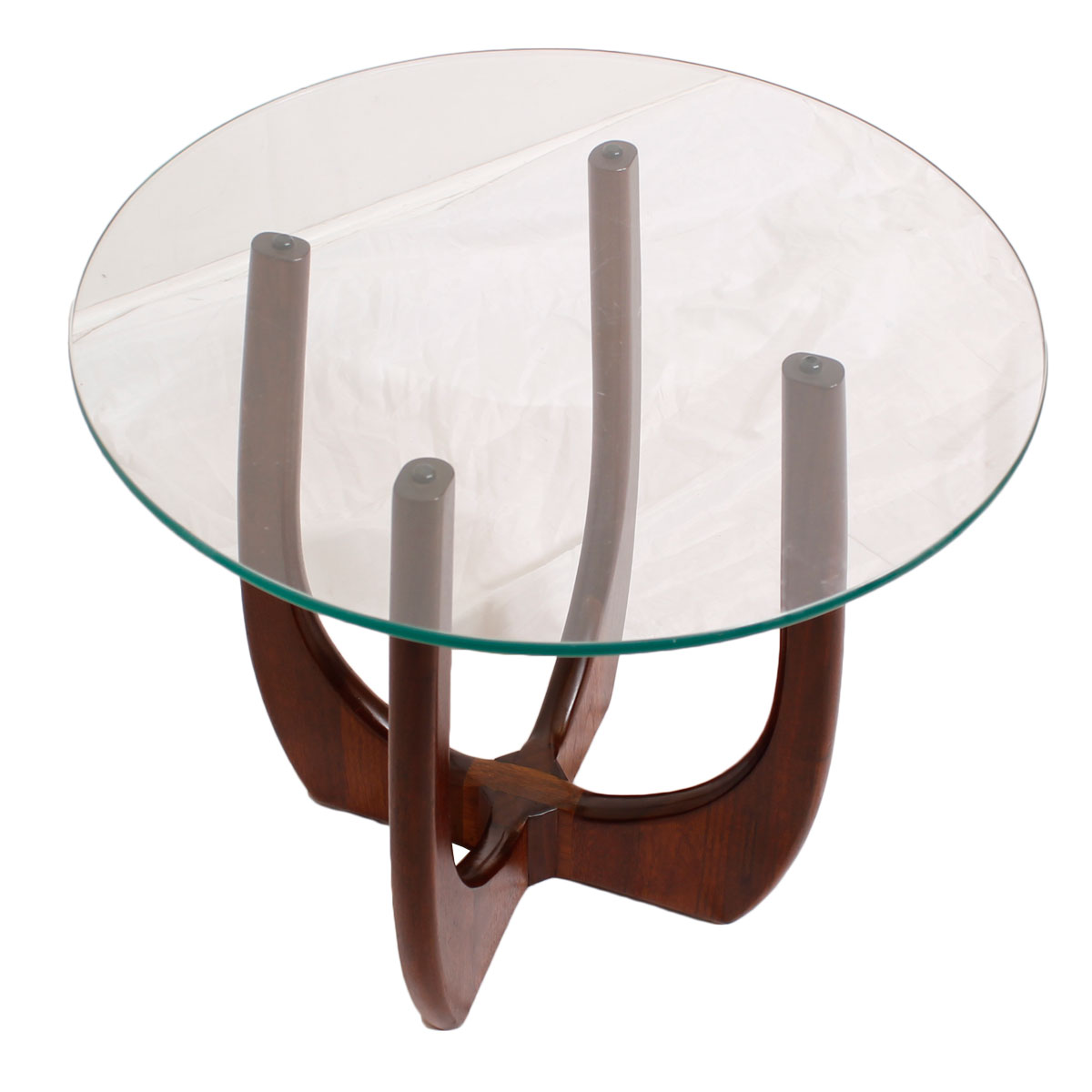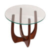 Great mid century side accent table. Incredibly secure joinery and construction that is telling as to the high quality of this piece. Thick glass top and dark walnut that sprouts from the floor like a flower. What a woderful piece!