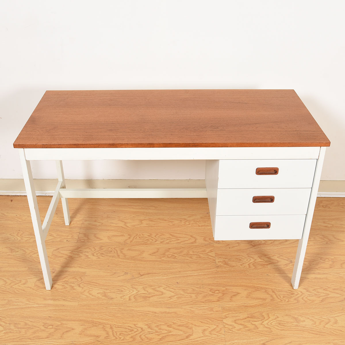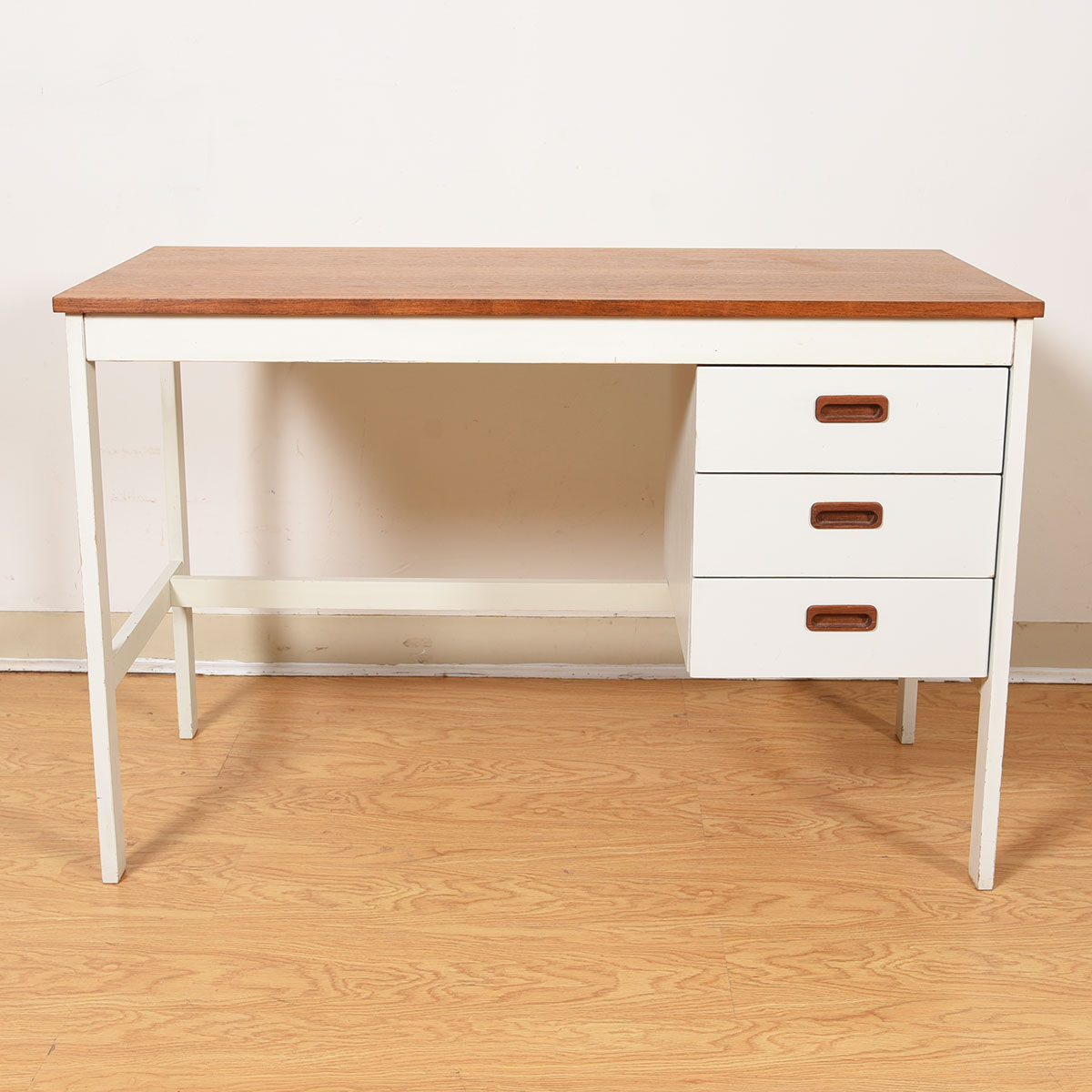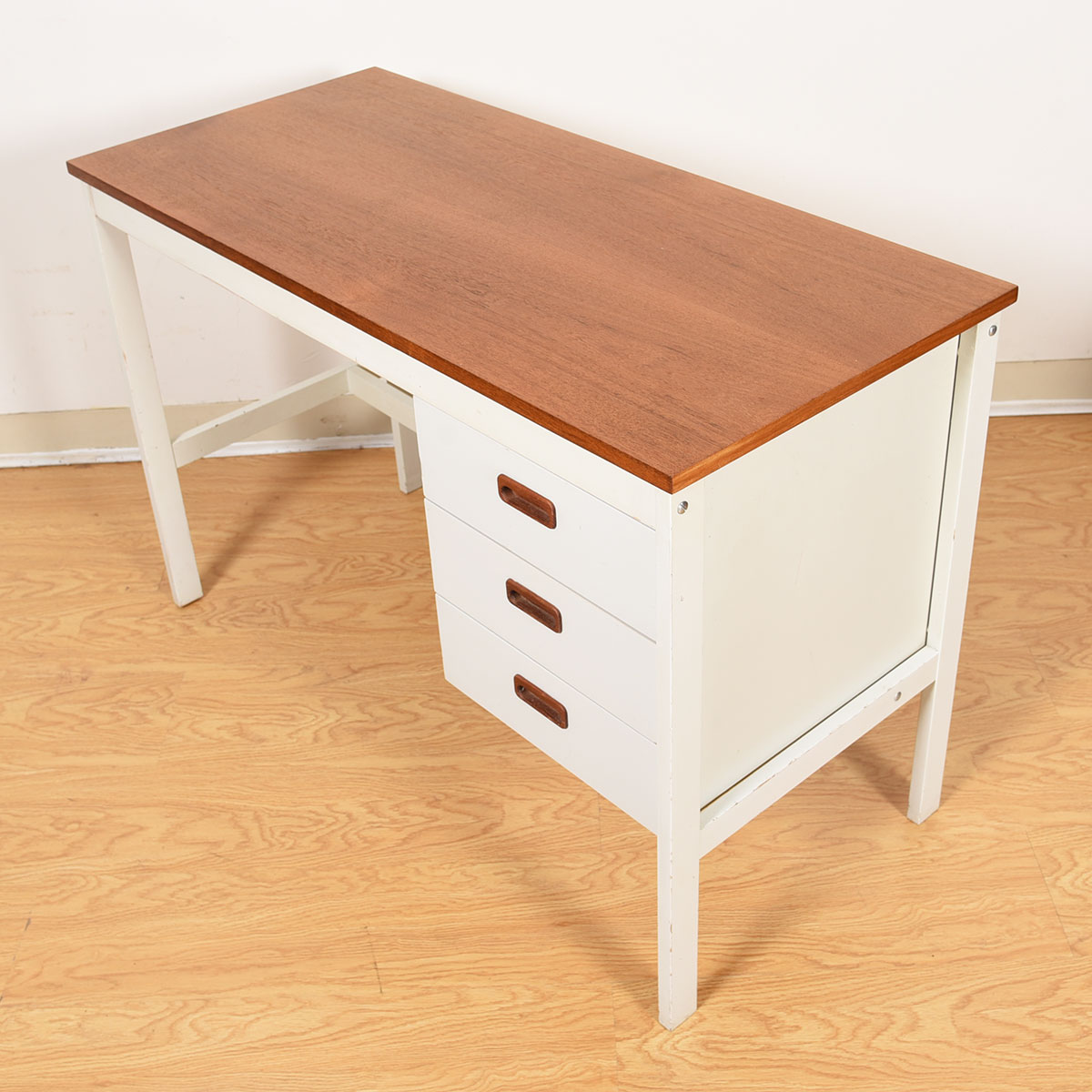 This is a wonderful Danish Modern desk, just the right size for small spaces or to be a kid’s first desk. Produced in white with a teak top and teak accents, it has three drawers on the right of the kneehole.
