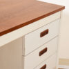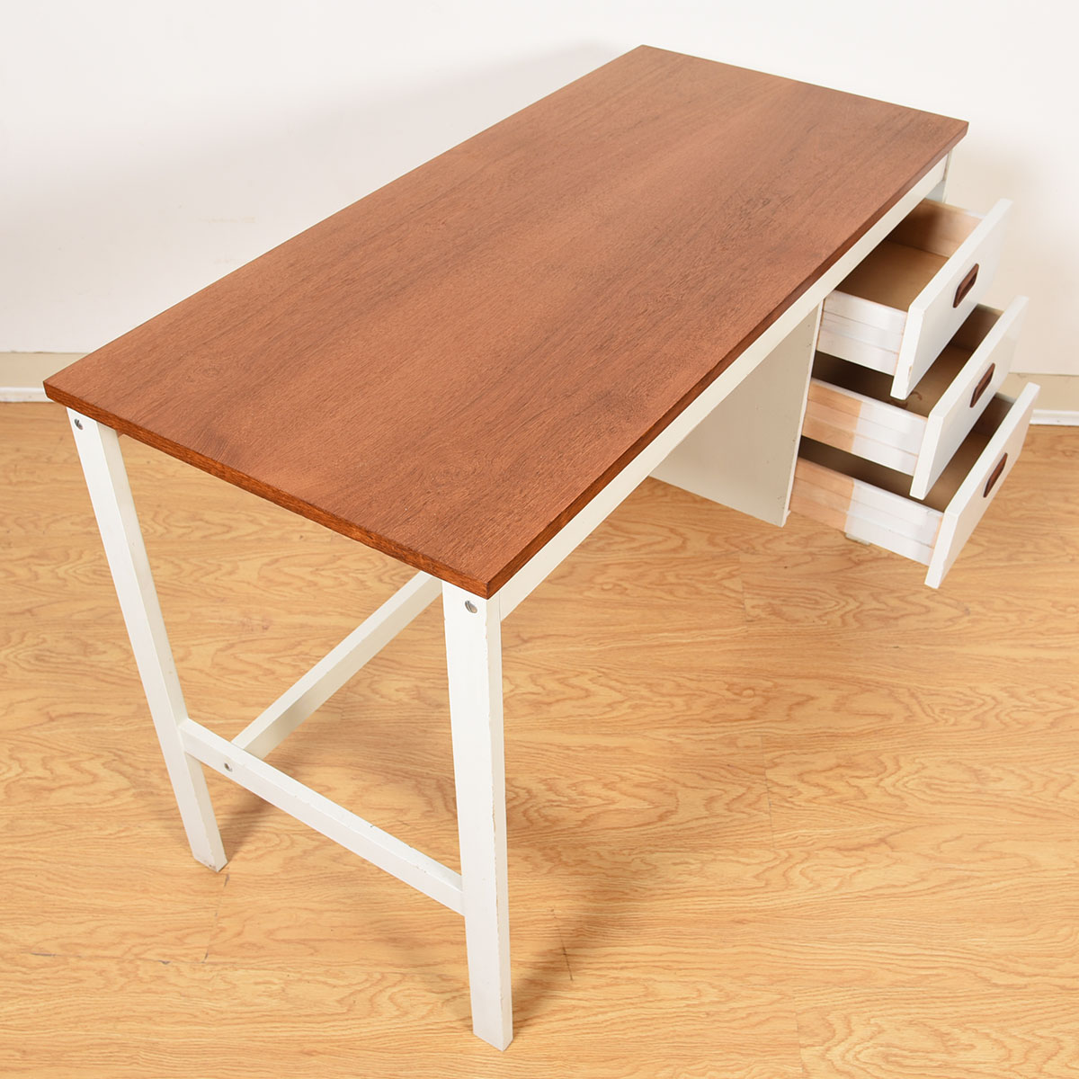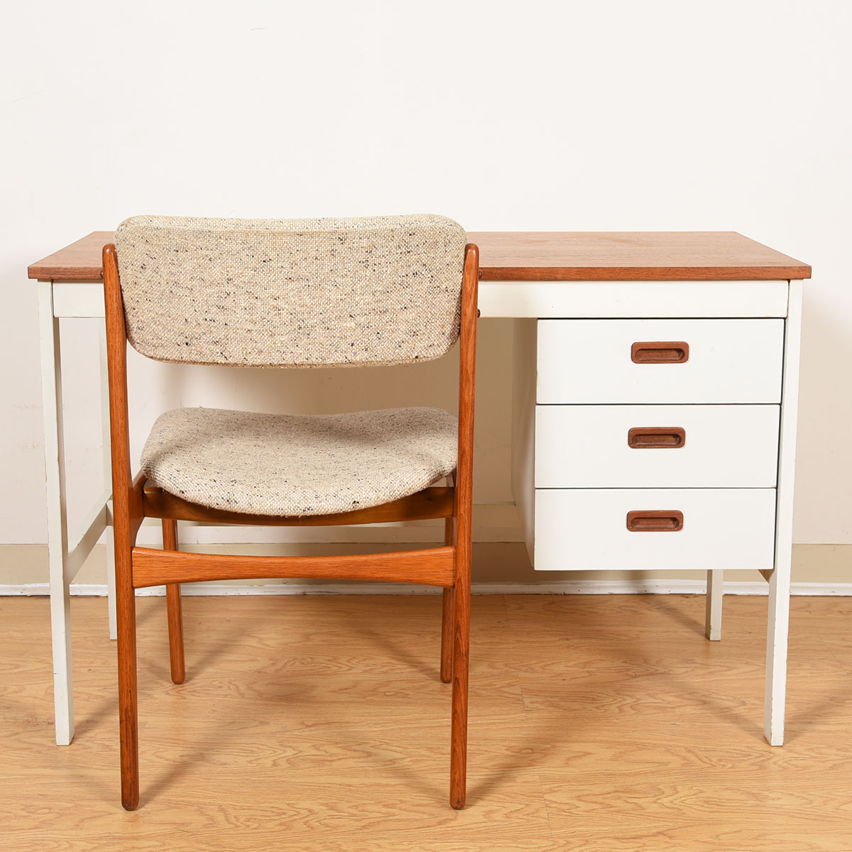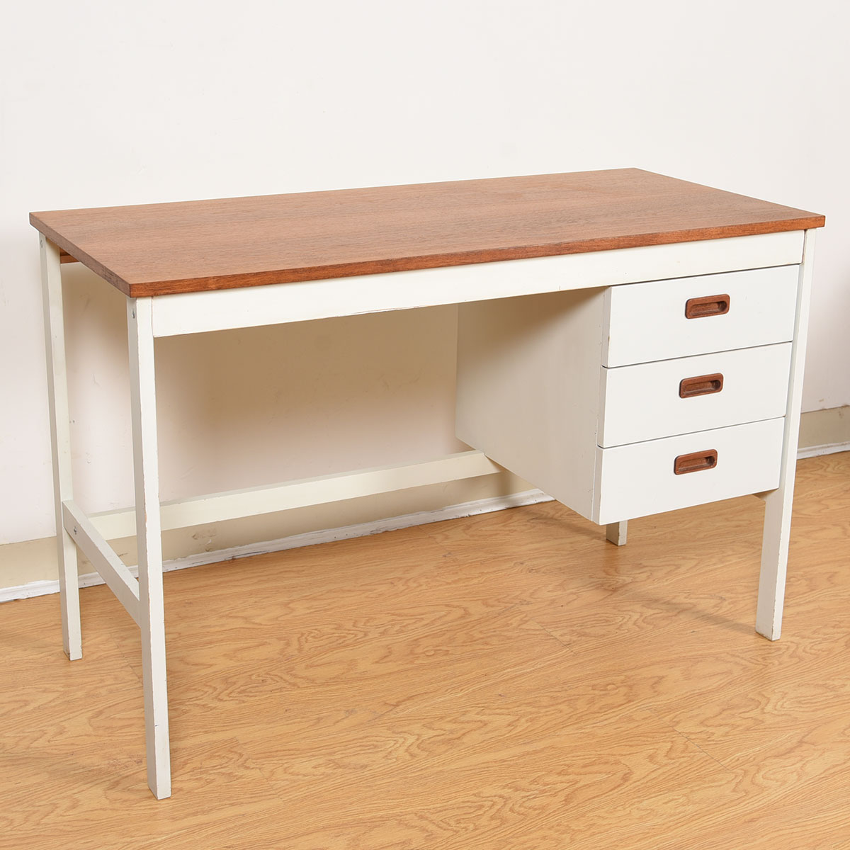 This is a wonderful Danish Modern desk, just the right size for small spaces or to be a kid’s first desk. Produced in white with a teak top and teak accents, it has three drawers on the right of the kneehole.