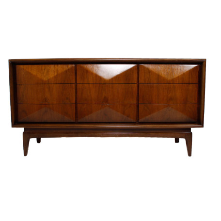 Vladimir Kagan Style Architectural Diamond-Front Dresser / Credenza. The bold sculptural drawer fronts are complimented by the beautiful Walnut wood grain. Nine drawers offer ample storage space and the compact size makes it an excellent choice to accomplish City-Living In Style!