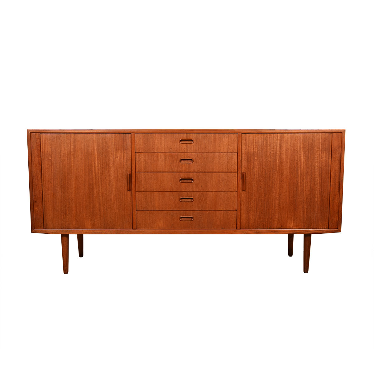On this refined sideboard, tambour doors flank a central bank of five large drawers. Oval inset pulls on each of the drawers are the only other adornment on this lovely piece.