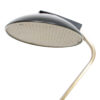 Wonderful MCM era desk lamp that puts light right onto your work area. The black metal cobra-head style shade can be adjusted on the brass arm, giving you focused or general light. The lamp base is metal with a faux wood grain panel on which sits the knob to turn the lamp on. Very Mad Men!
