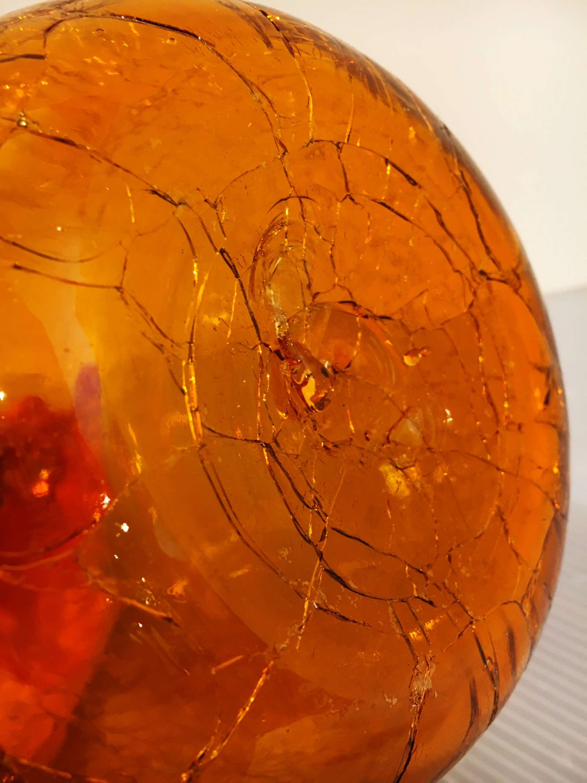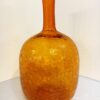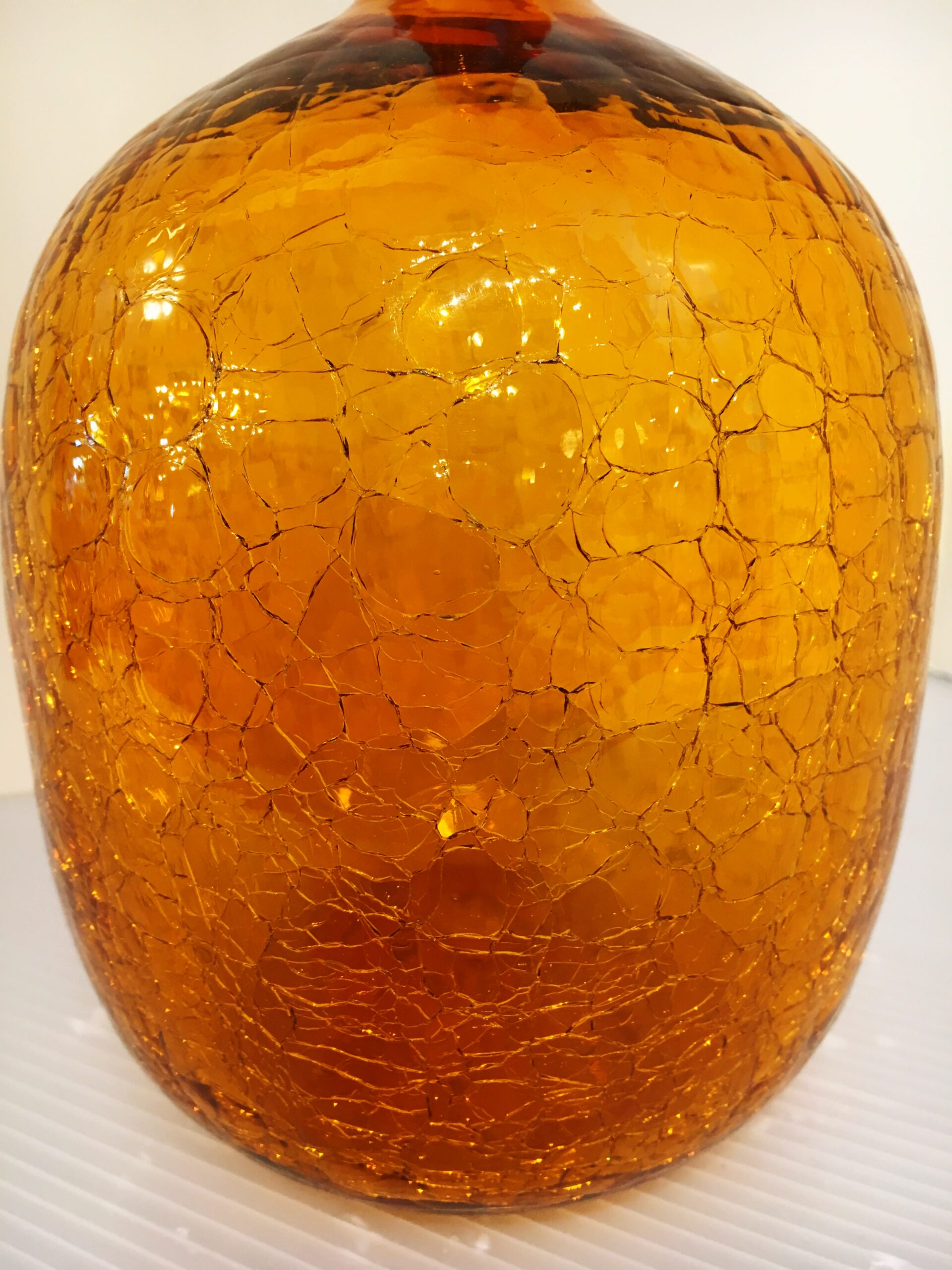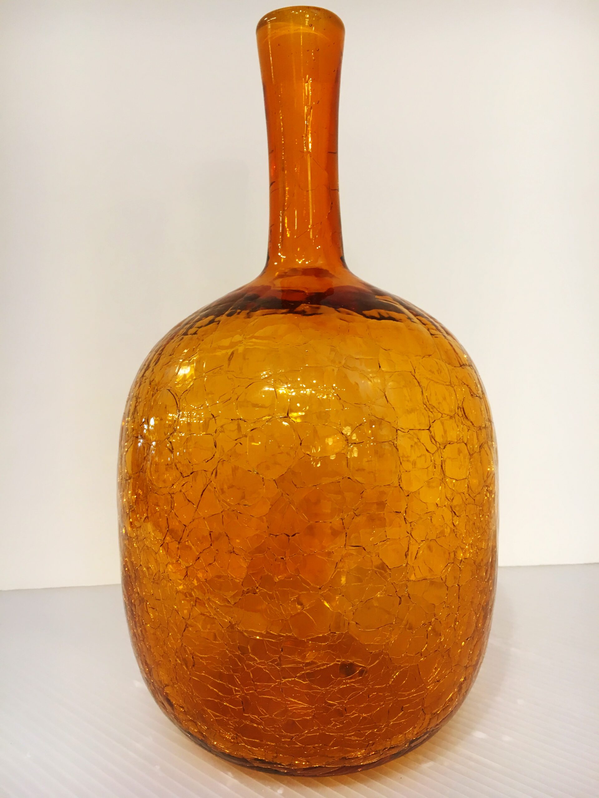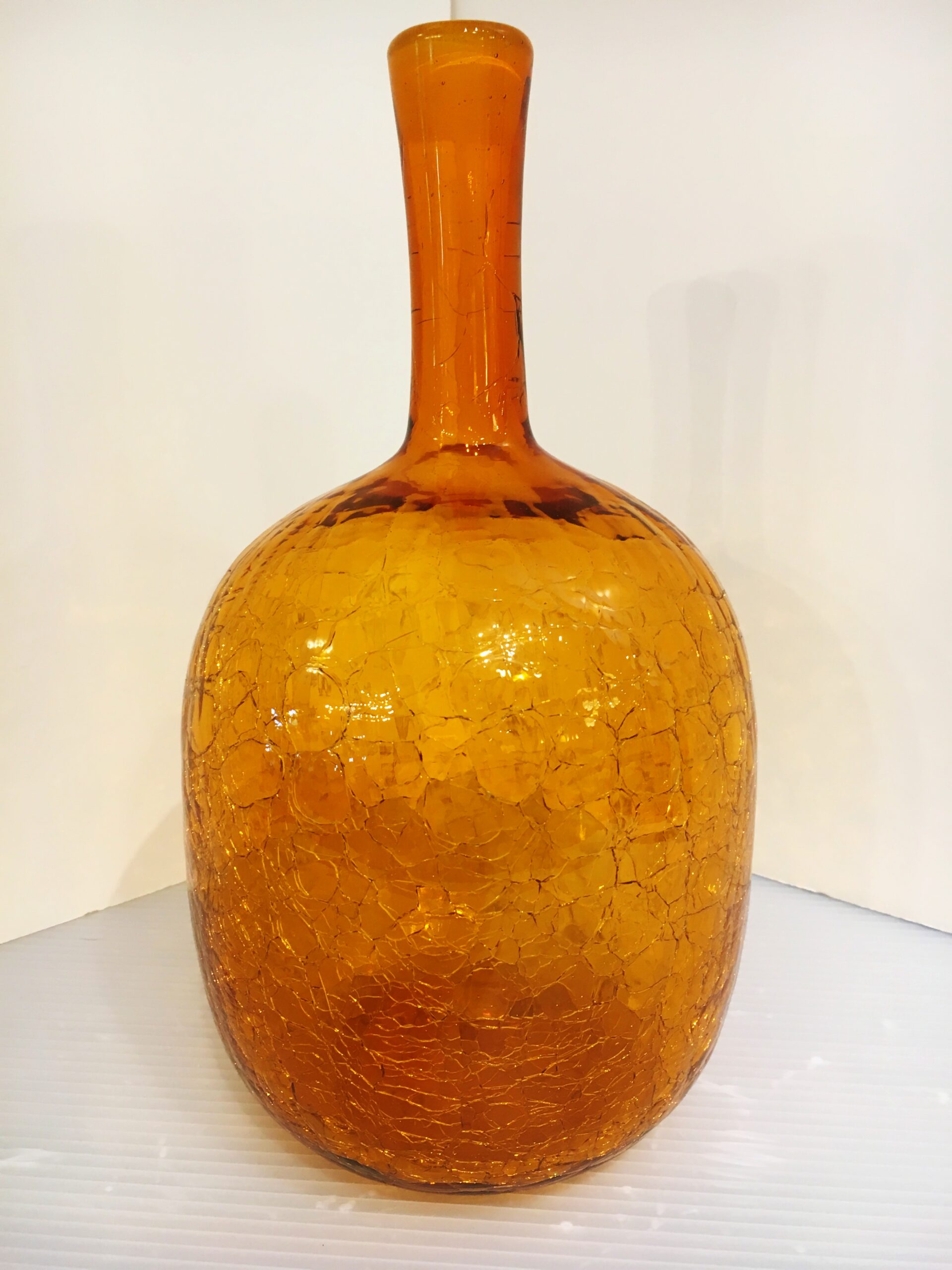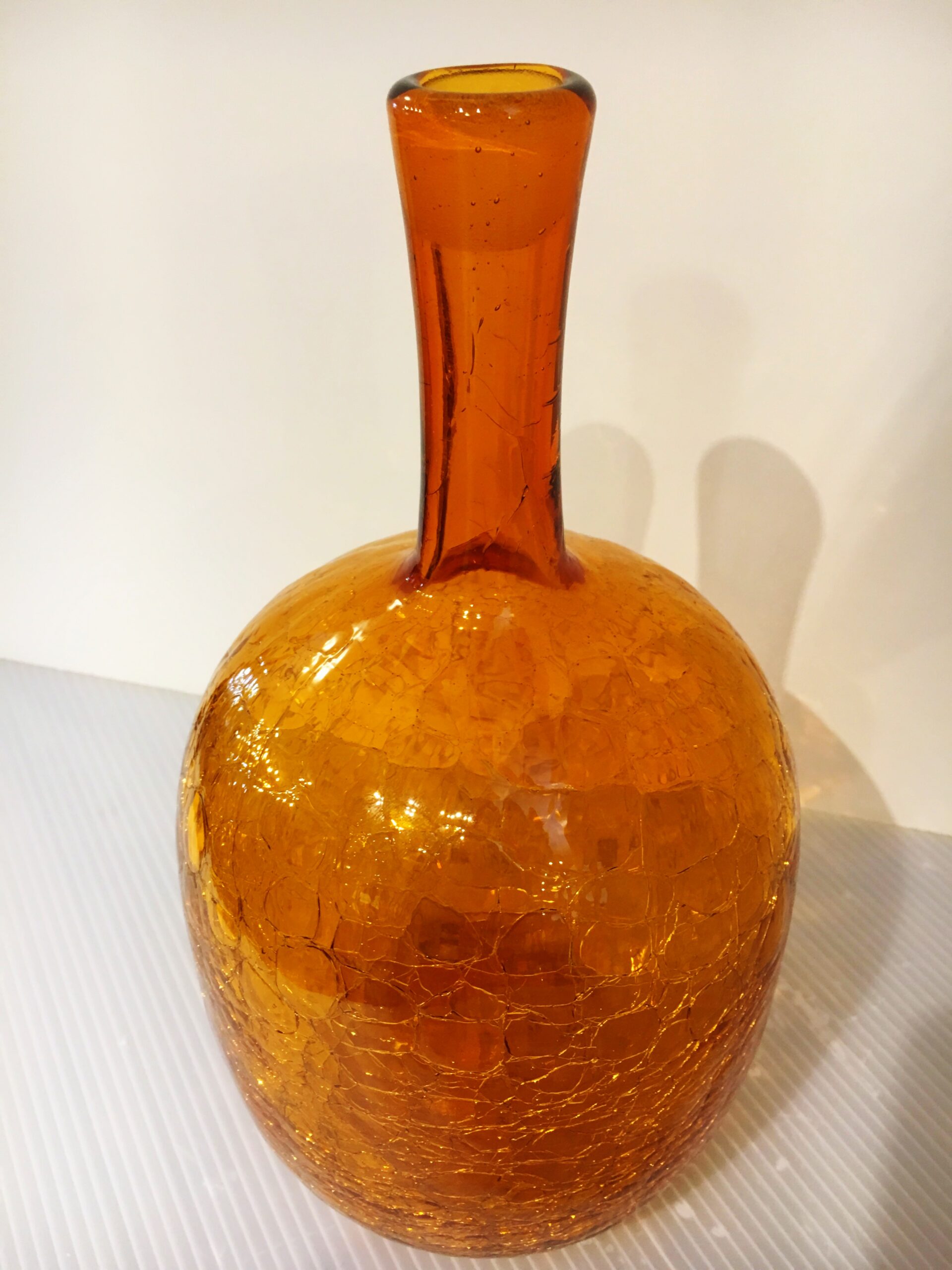 This golden-hued bottle from Blenko makes a great accent piece on a shelf or table. Good size and has a gorgeous form, featuring Crackle Glass on the body of the piece. No chips or cracks.