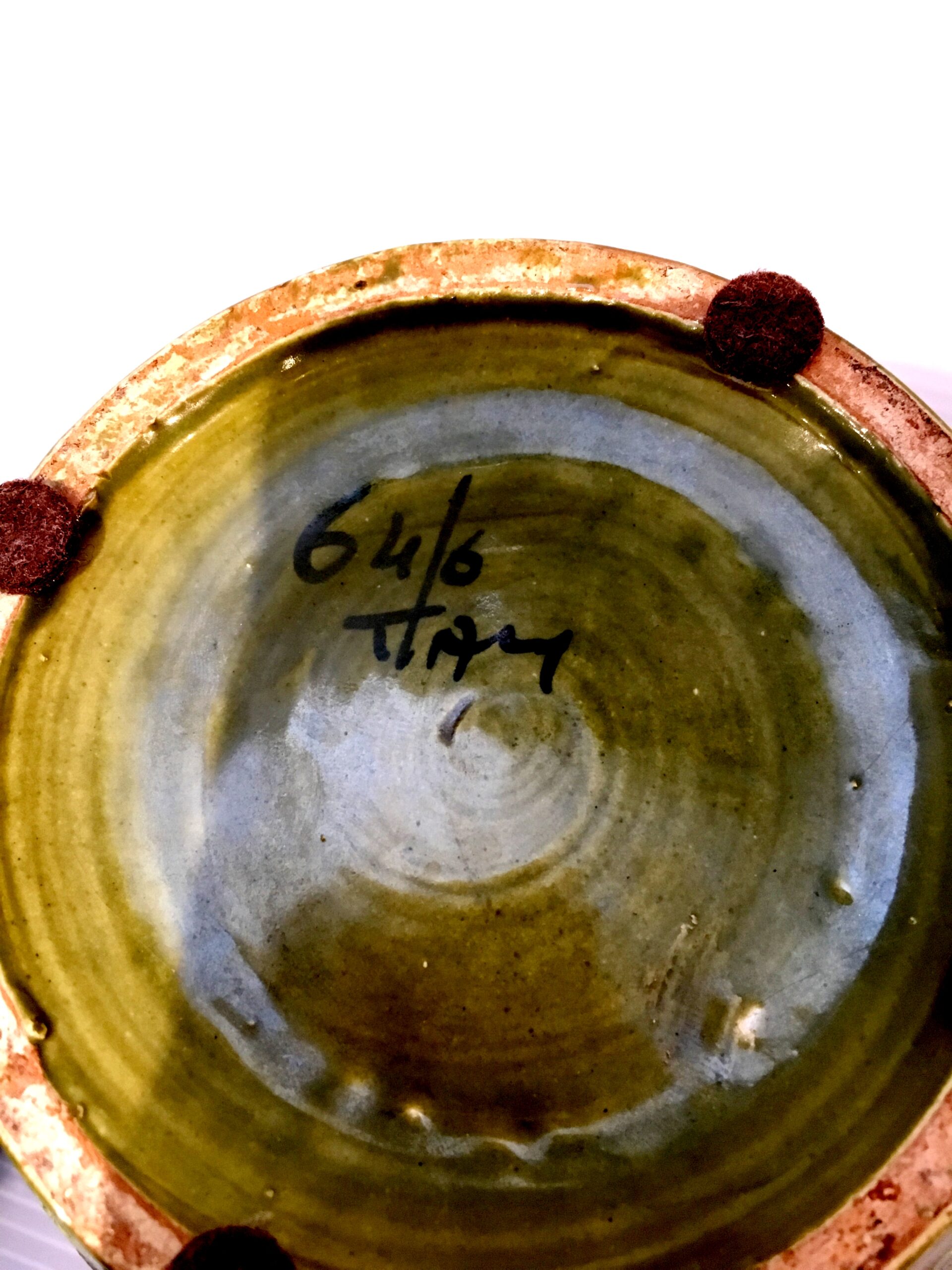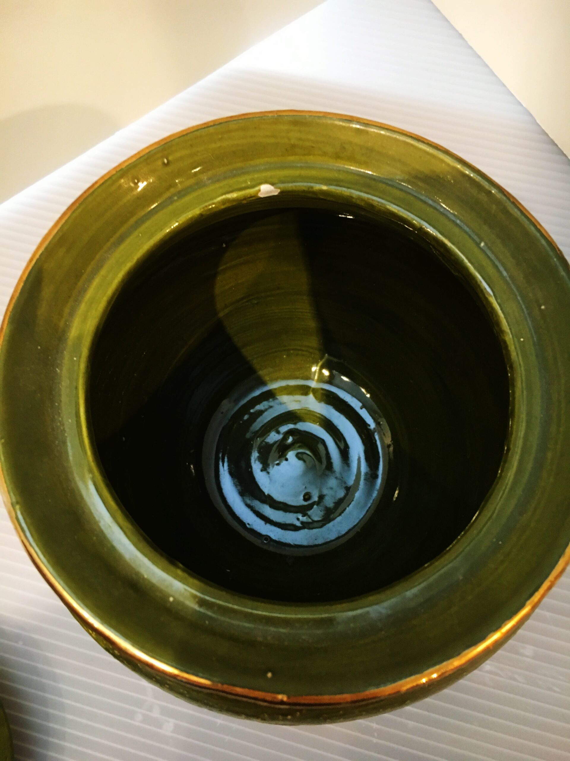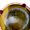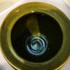 The colors in this lidded jar – blue and dark olive green – are really set off by the touches of gold throughout. Incised with a Bitossi style design, this dècor item is Italian majolica. There is a small chip to the glaze only (not the piece) on the inner rim of the mouth of the jar, which is not visible when the lid is on. 7.5″h x 6″w