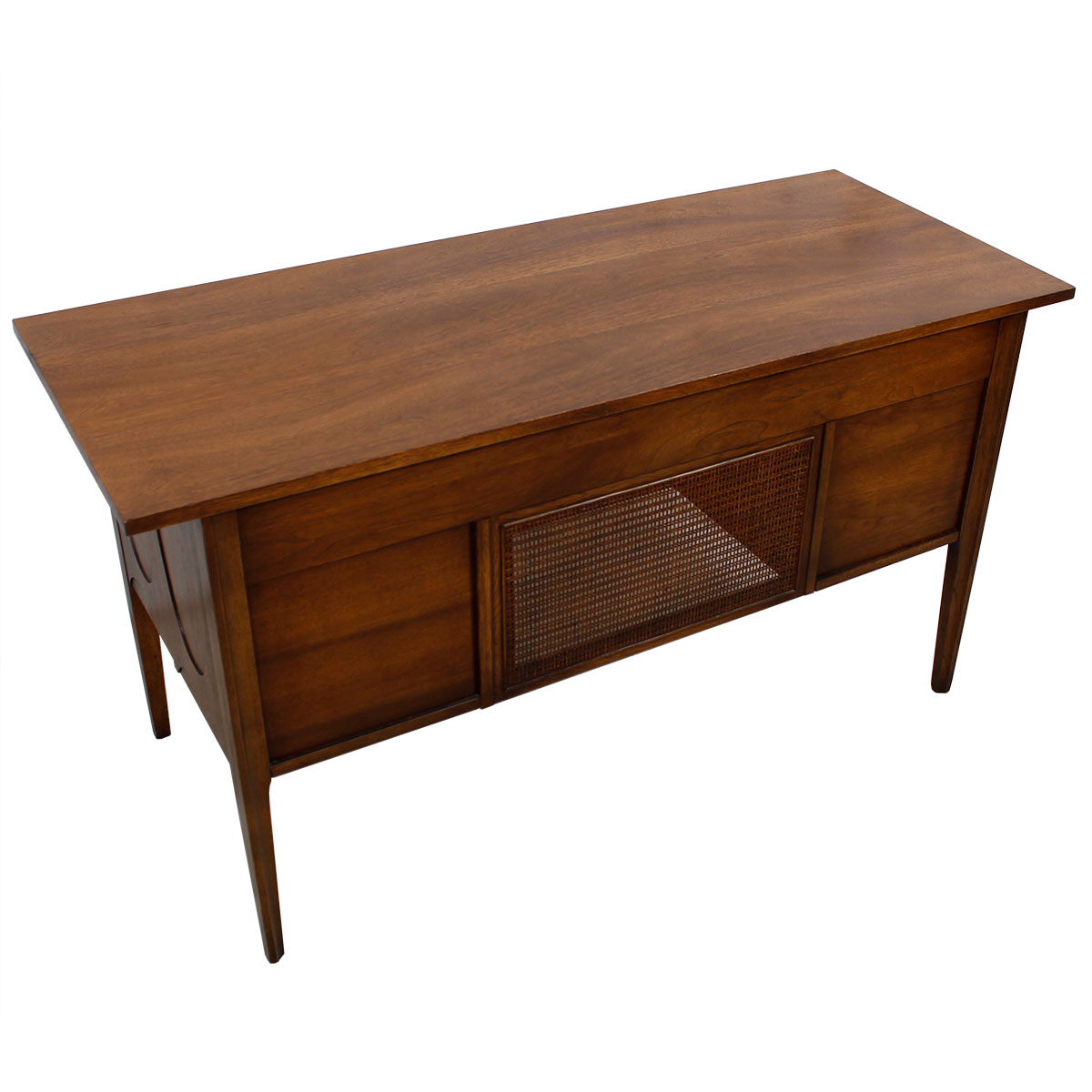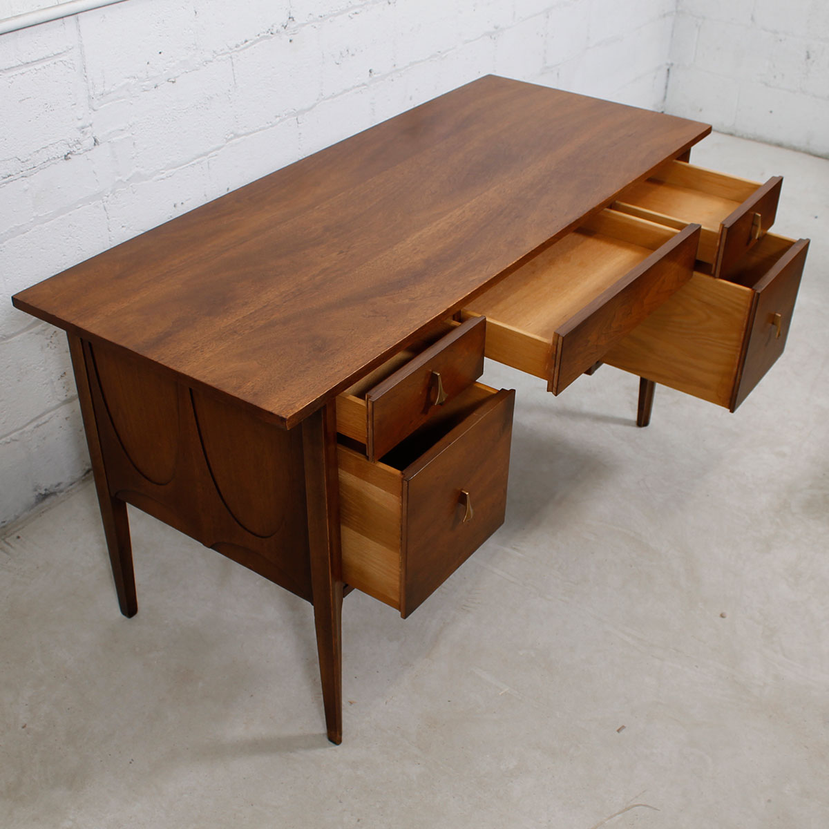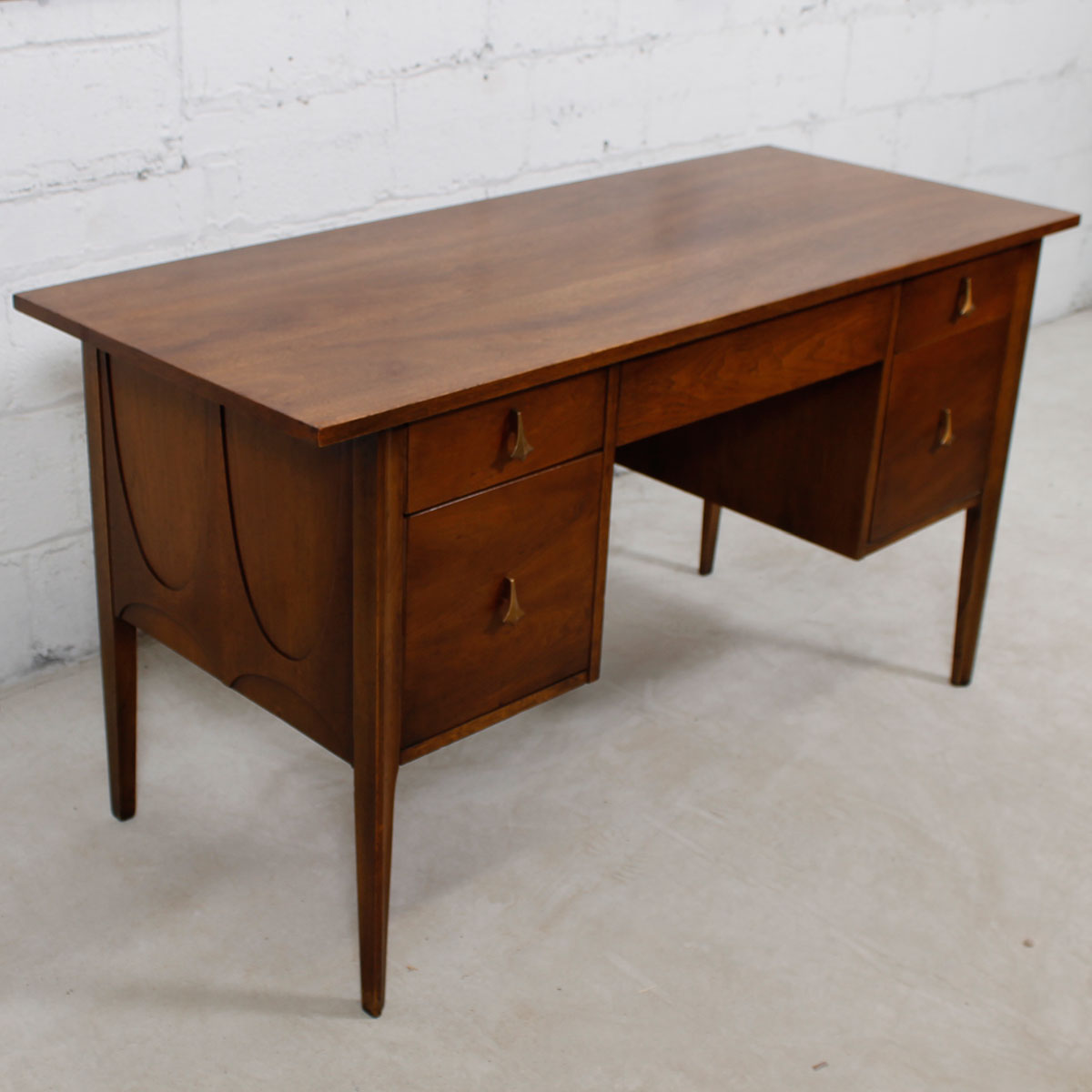Featuring the famous Brasilia “swoop” that evokes the exuberant architecture of Oscar Niemeyer and the Brazilian capital, this walnut desk was part of the Brasilia collection by Broyhill from the ’60s. Great lines and great storage make a highly functional and beautiful piece of furniture at which to work.