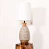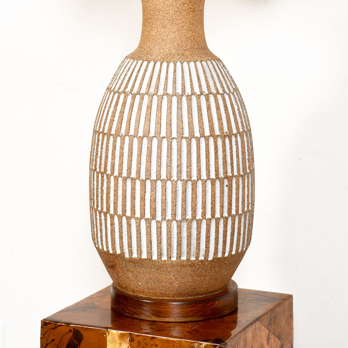 - Hand thrown California studio pottery lamp minimally decorated with white glazed tally marks over raw clay
