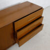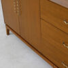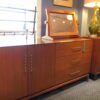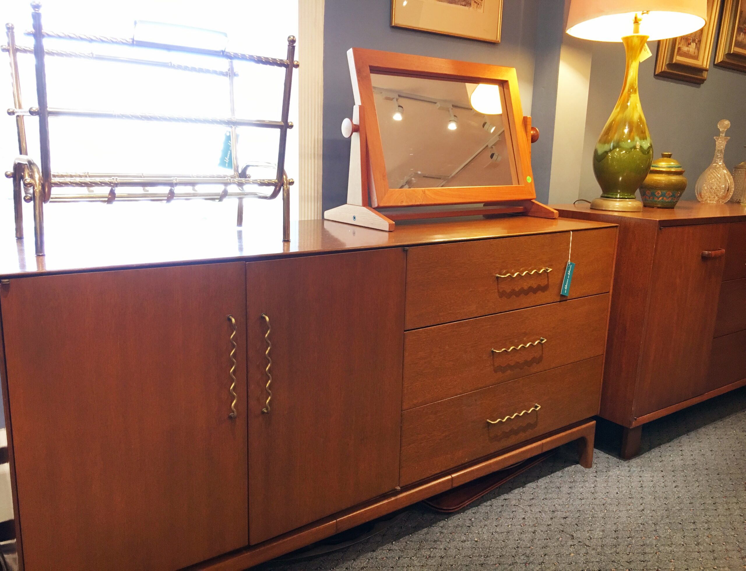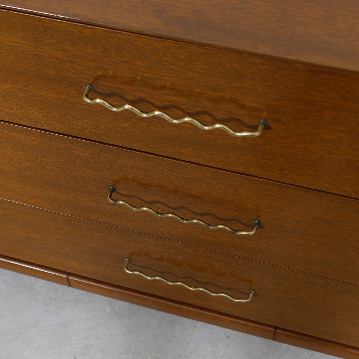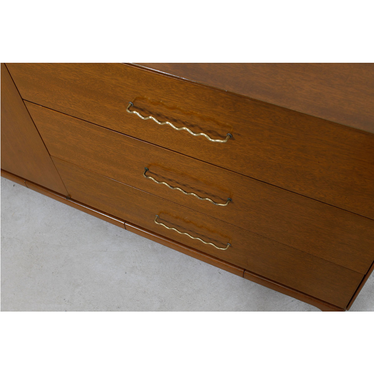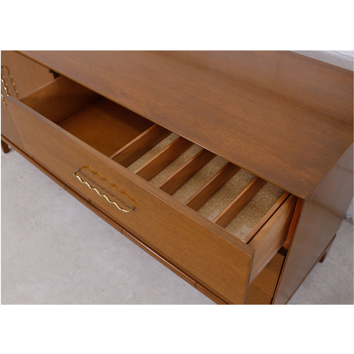 This is an interesting sideboard designed in the ’50s by John Keal for Brown Saltman. Despite its age it looks very fresh and current, due in part to the configuration of the storage, the thin edge design, and the signature brass “squiggle” handles.