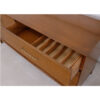 Visually the front of the piece is divided in half. The left side has two doors opening out to reveal cubby space; the right is comprised of these deep drawers. It sits on a deceptively simple base with slightly splayed legs – the subtle details of the base add a lot of character to the sideboard.