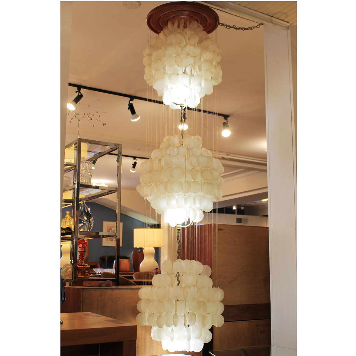 To arrange purchase or for more information about the Three-Tier Capiz Shell Waterfall Chandelier please call us at 202.882.1648 or email us at info@modernmobler.com