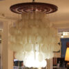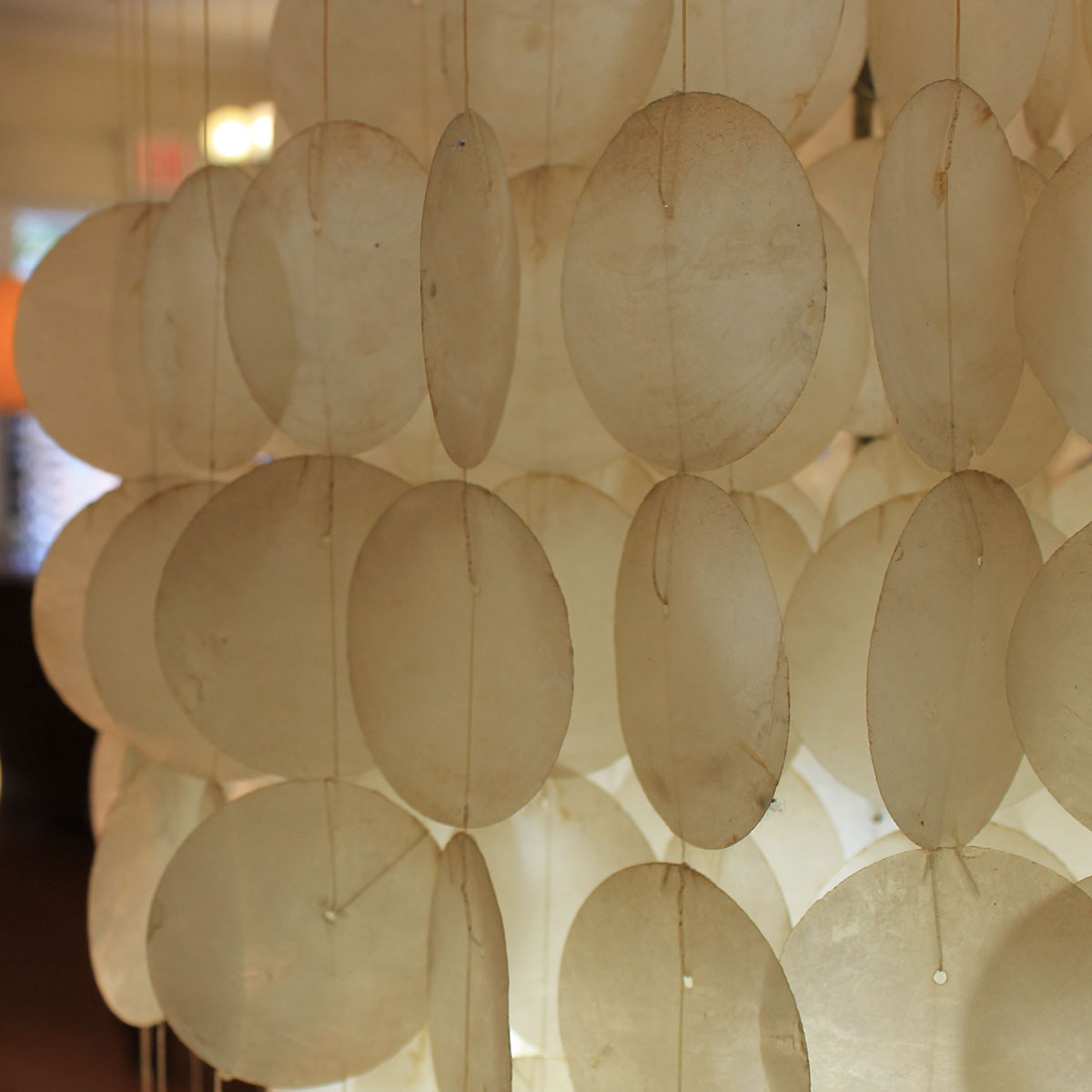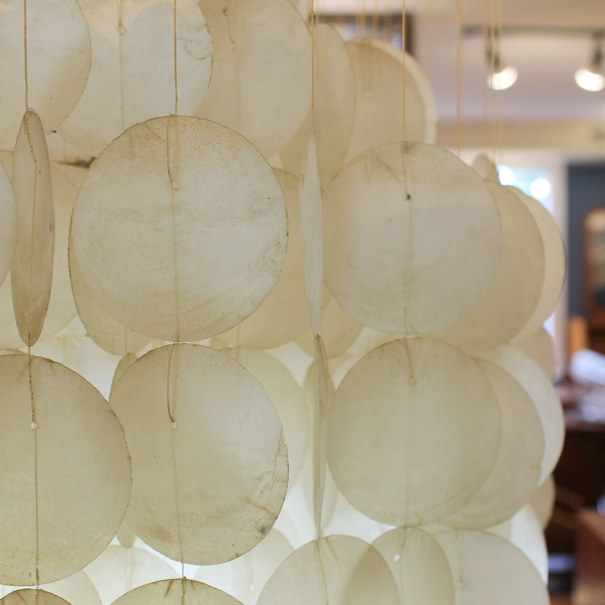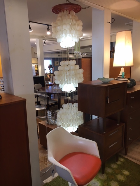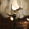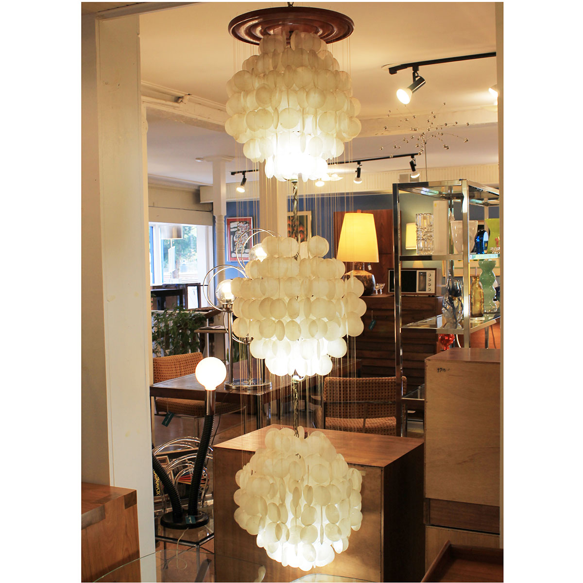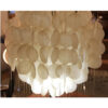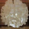 In the style of Verner Panton comes this three tier waterfall chandelier. Three “balls” comprised of capiz shells form the shape. Hang in a corner or in a tall entryway. Gives off a beautiful light and it’s gentle movement in a breeze is lovely to behold.