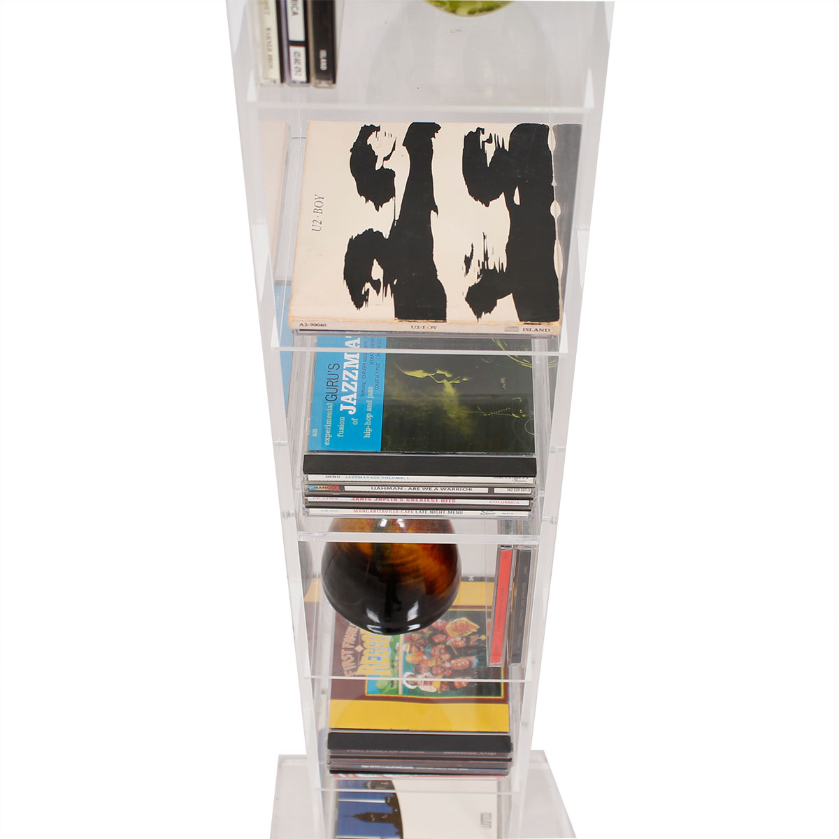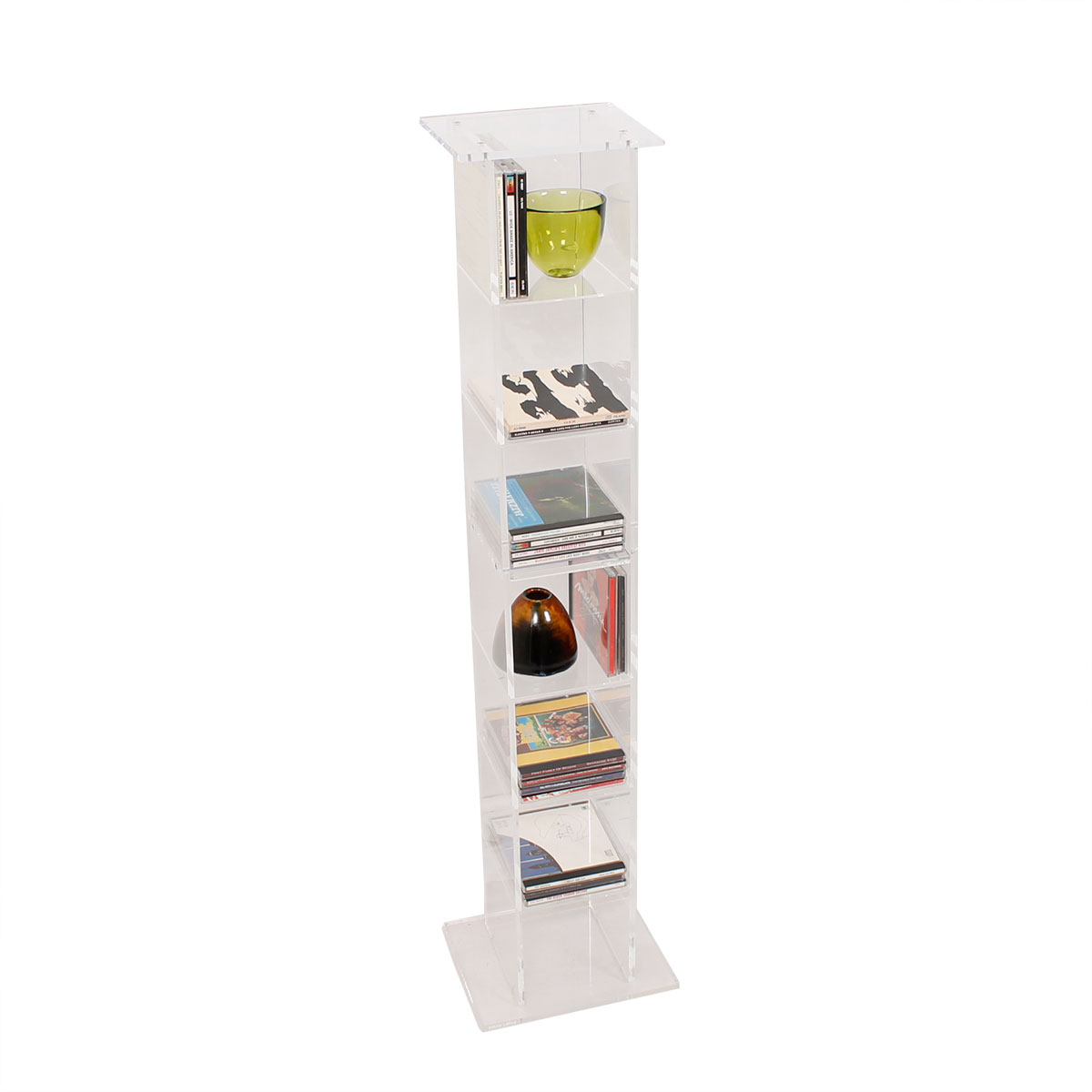 Nice Compact floor standing display shelf or CD rack. Made of clear acrylic it offers 6 shelves which provides 7 cubby-holes for display and media storage.