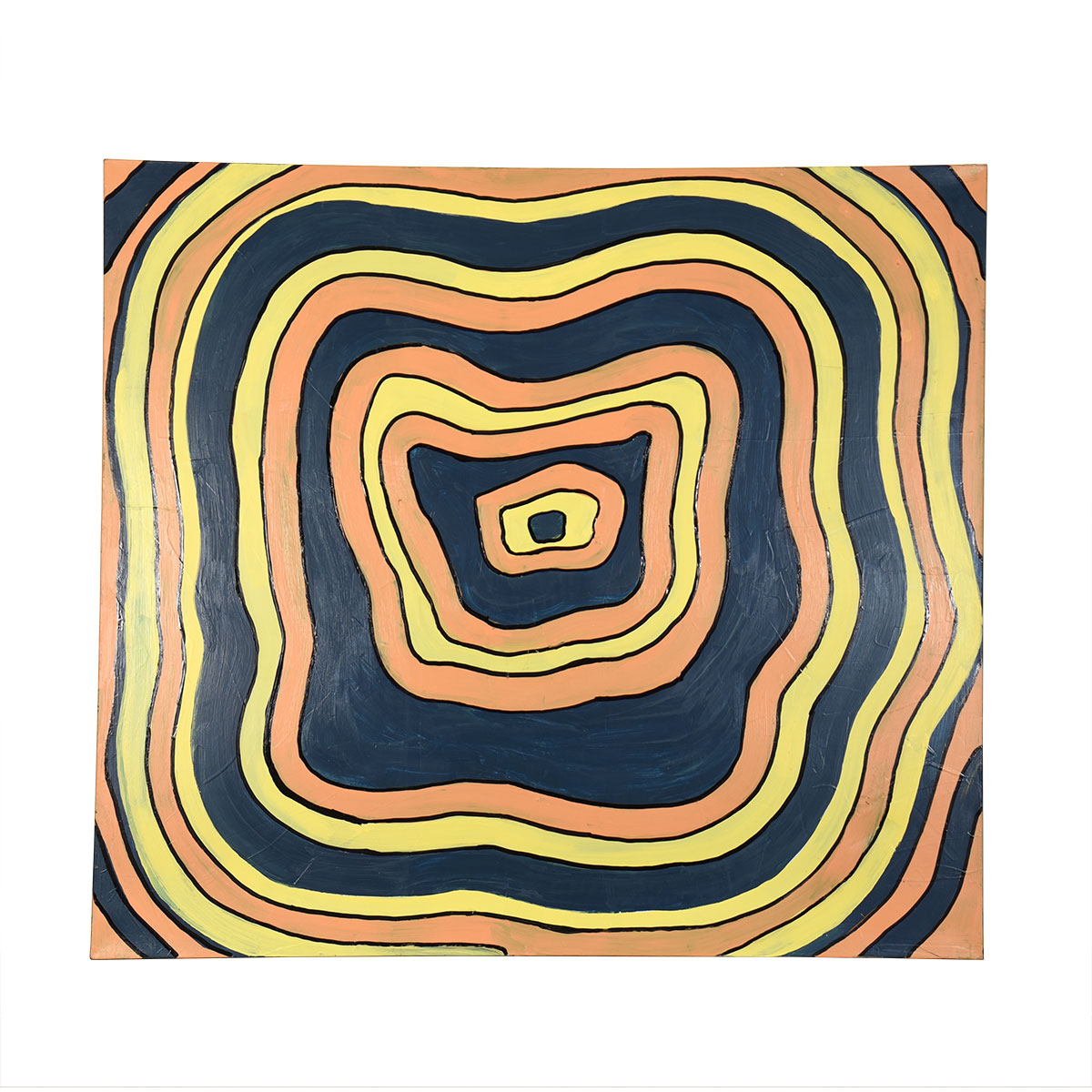 - Irregular concentric circles of orange, yellow, green and navy draw you into their spiral in this mesmerizing op art piece