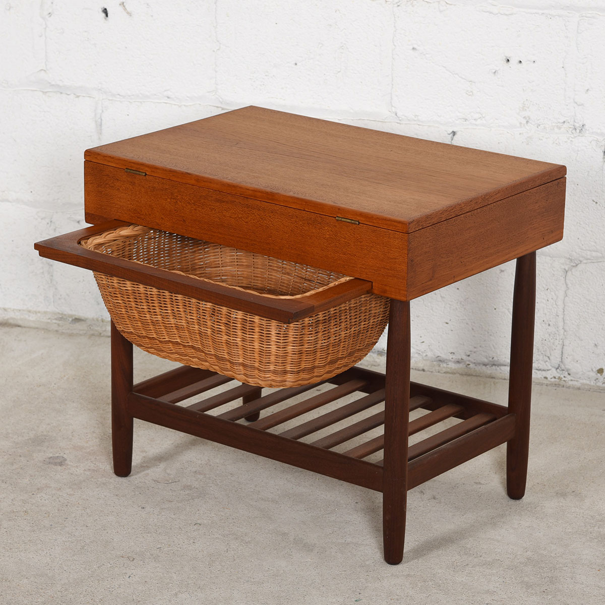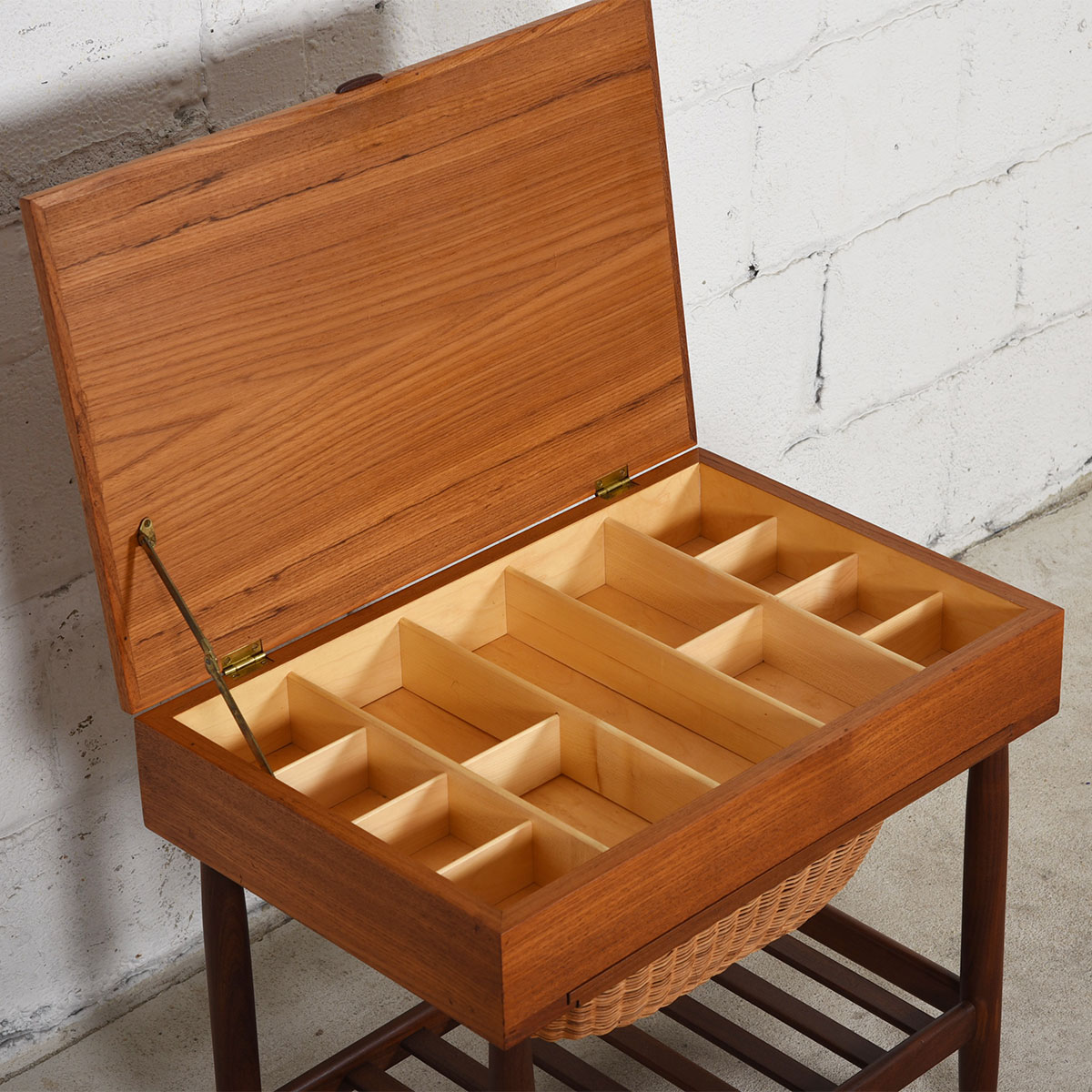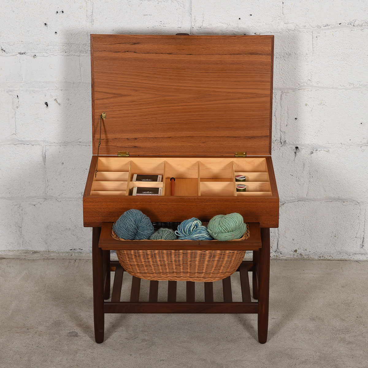 This beautiful old Danish sewing table is made of teak. The top lifts up to reveal an area of divided storage compartments for notions. Below that a shelf pulls out into with basket to keep fabric, yarn and other larger items.