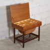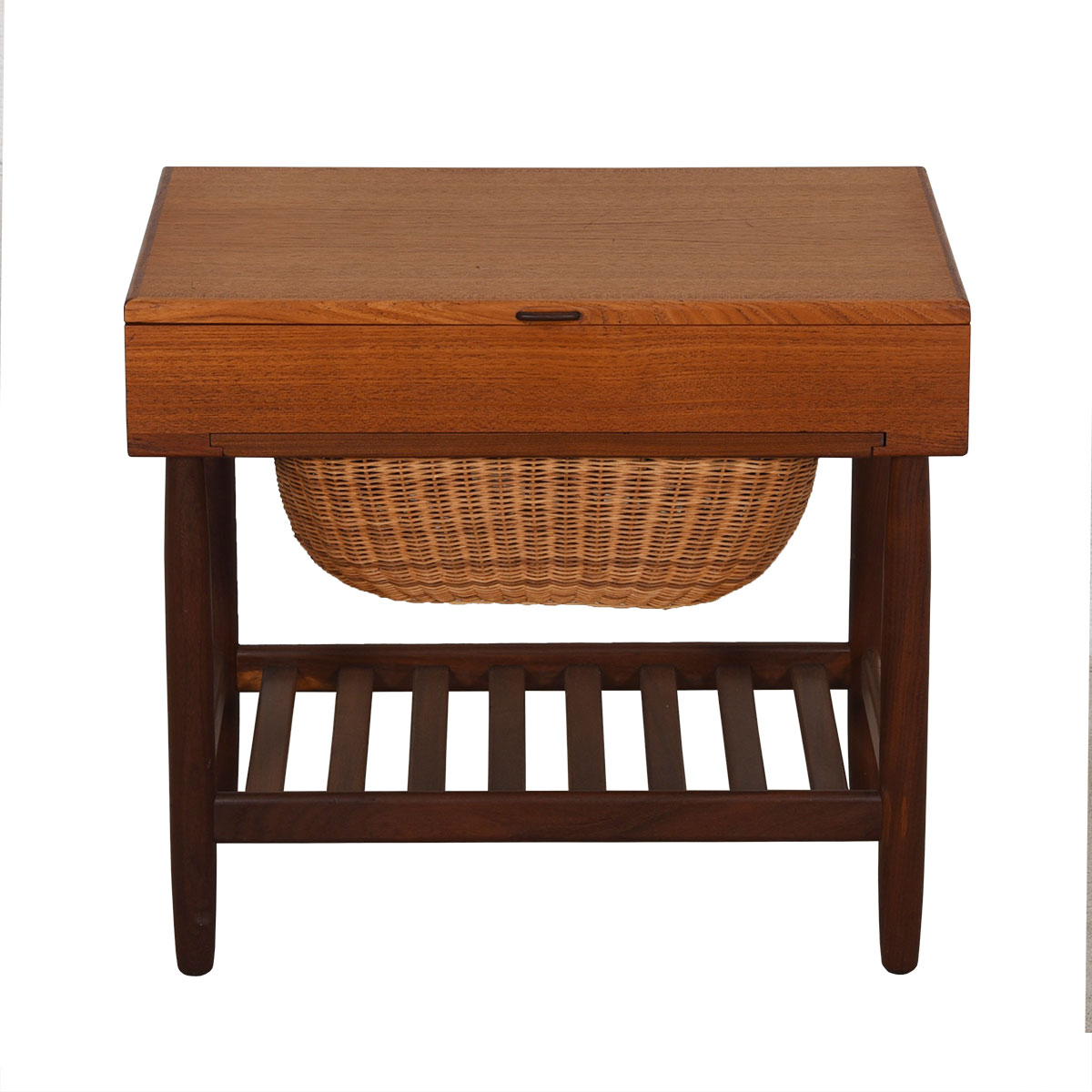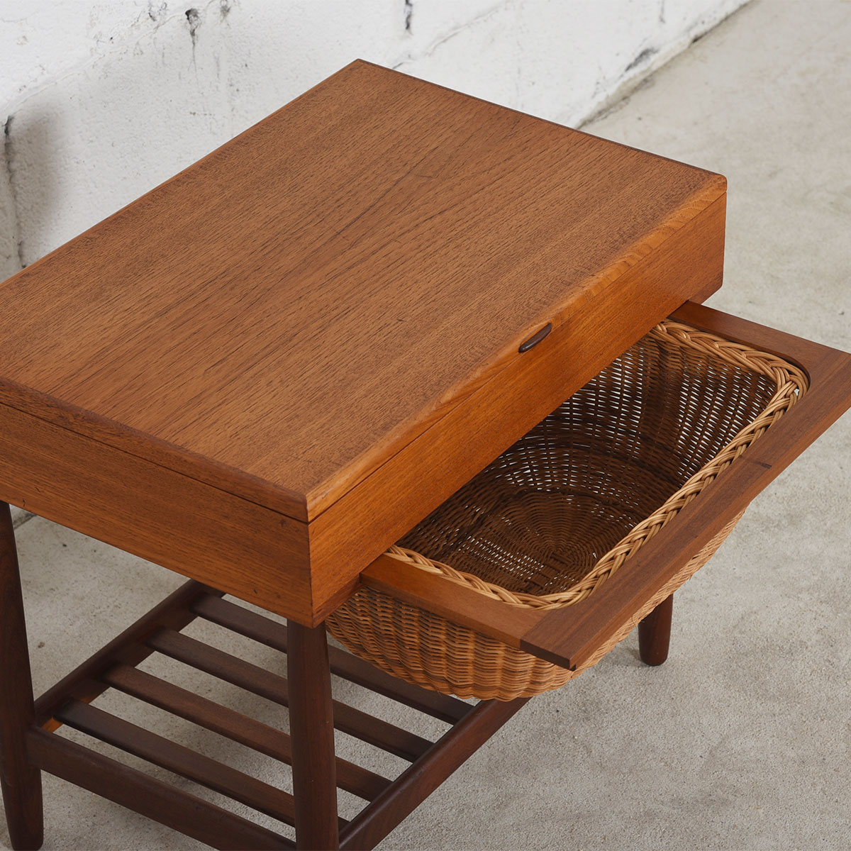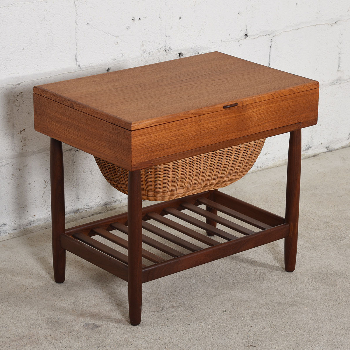This beautiful old Danish sewing table is made of teak. The top lifts up to reveal an area of divided storage compartments for notions. Below that a shelf pulls out into with basket to keep fabric, yarn and other larger items.