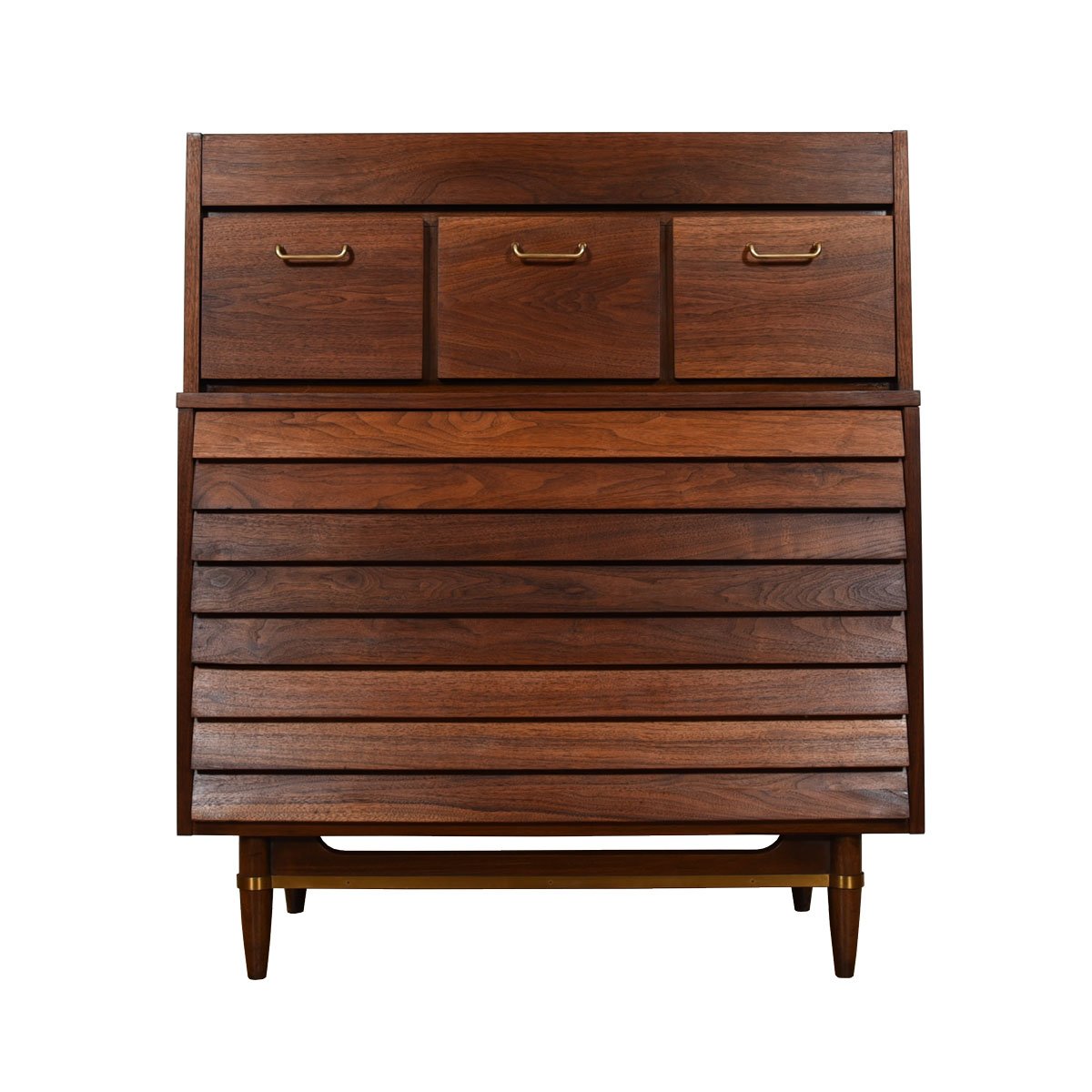 To arrange purchase or for more information about the Compact Walnut Mid Century Slatted Front Tall Chest of Drawers / Dresser please call us at 202.882.1648 or email us at info@modernmobler.com
