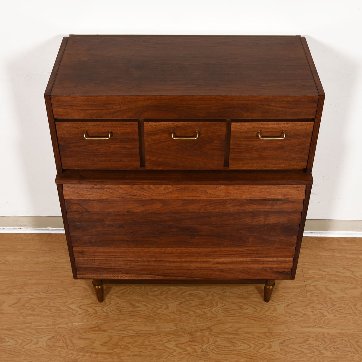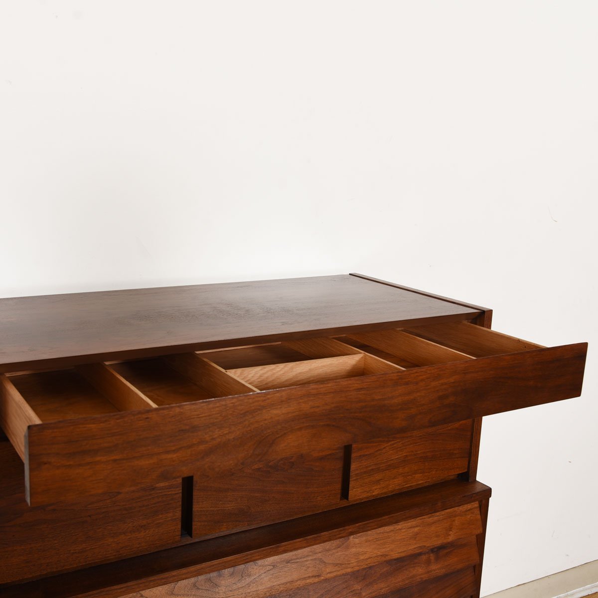This Mid Century Modern dresser was manufactured by respected American manufacturer American of Martinsville. Of walnut, it dates to the early ’60s and offers plenty of storage in a relatively compact piece.