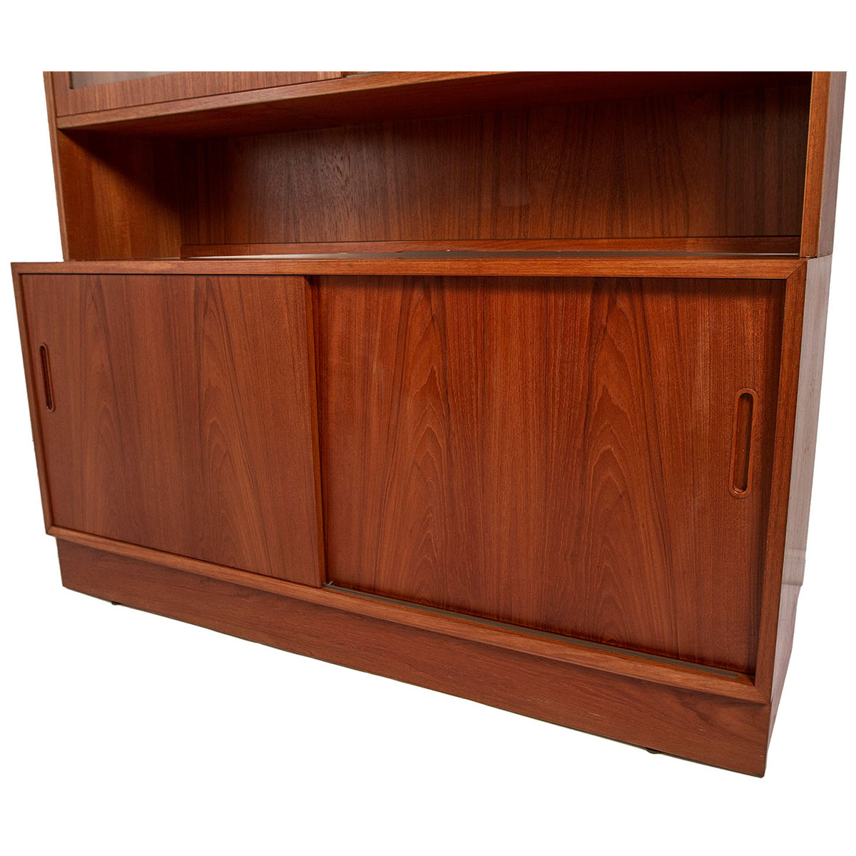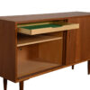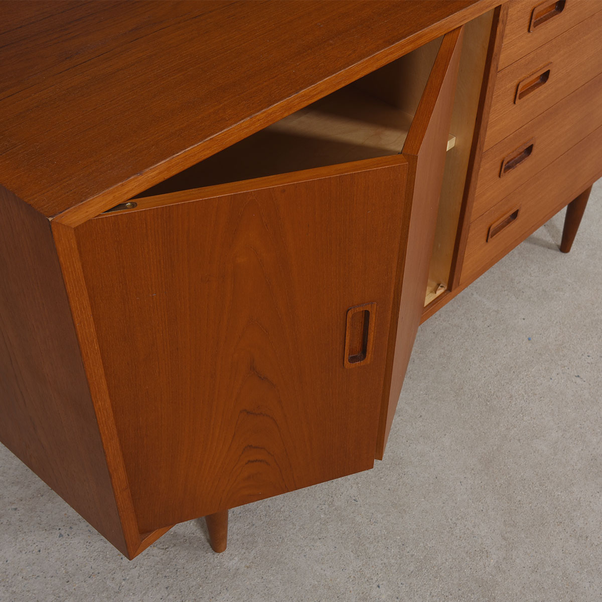 This compact Danish Modern teak sideboard with two adjustable shelves and one felt-lined drawer is the perfect candidate to house your media components. The handles are vertically-carved ovals with a small frame around. The piece has two space-saving sliding doors. Of course, it would also still be a great choice to use in your dining room for storing items and serving.