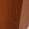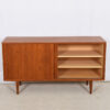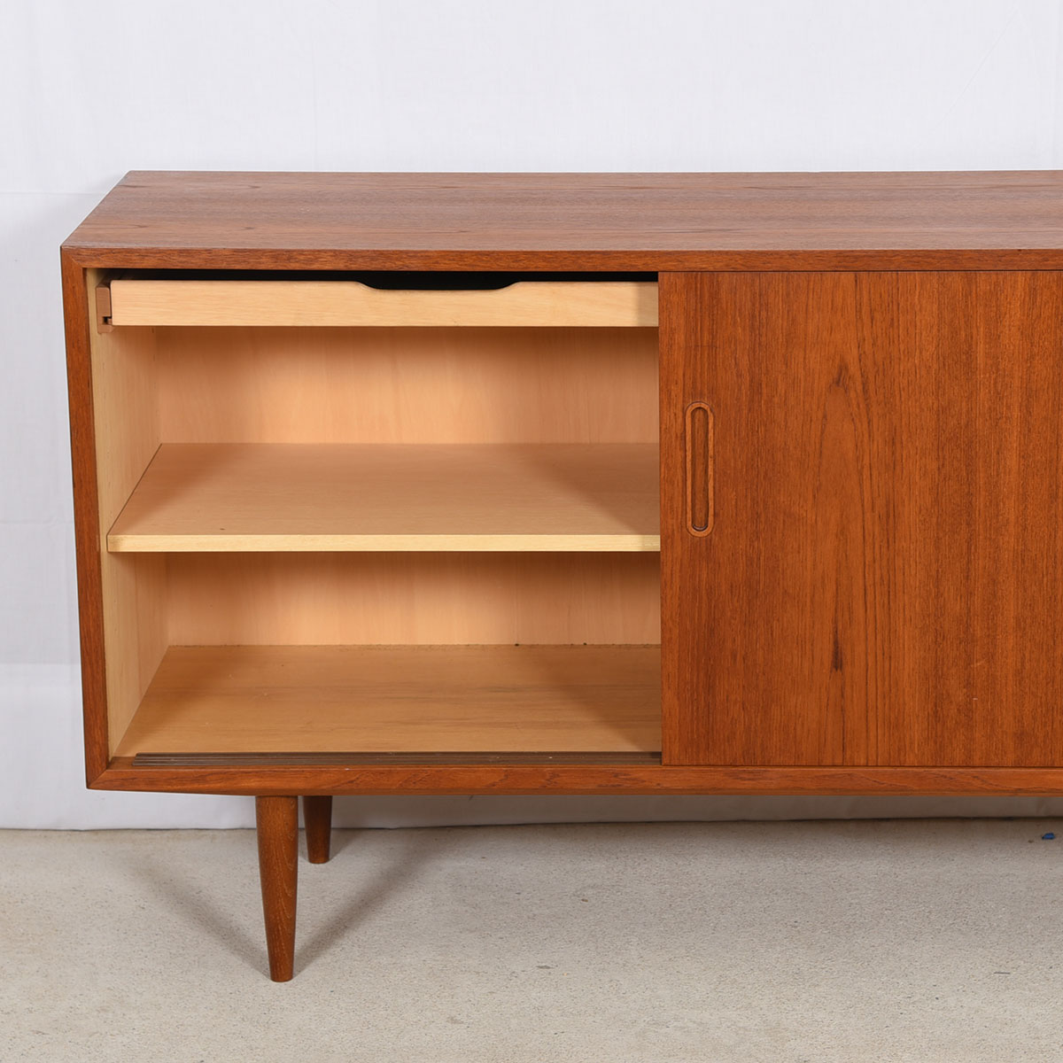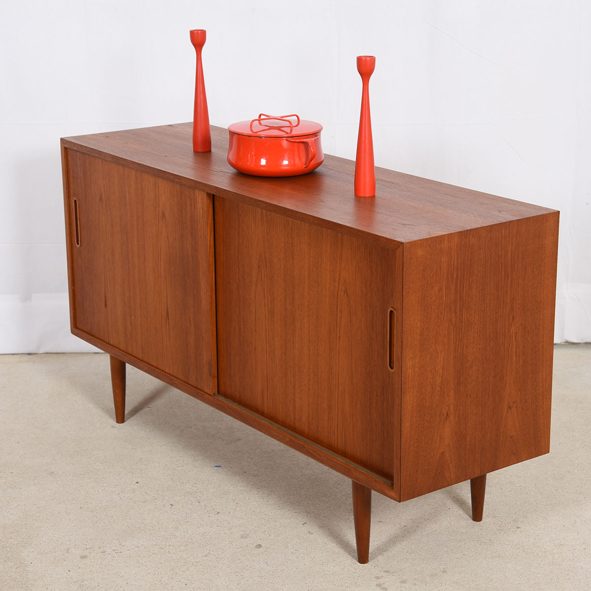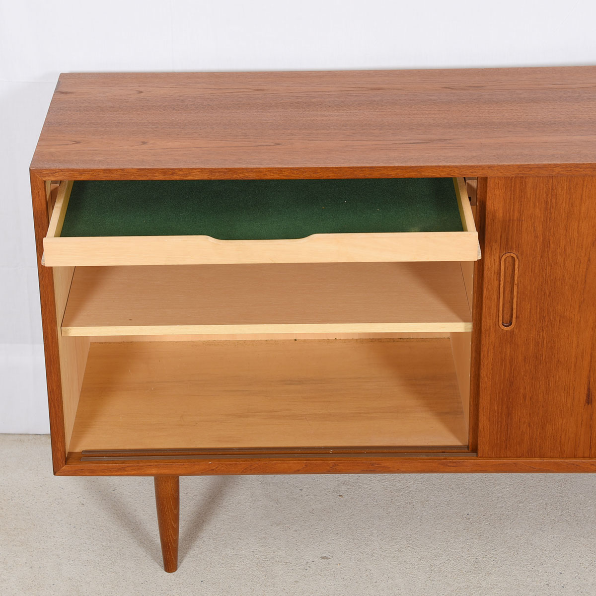 This compact Danish Modern teak sideboard with two adjustable shelves and one felt-lined drawer is the perfect candidate of house your media components. The handles are vertically-carved ovals with a small frame around. The piece has two space-saving sliding doors.