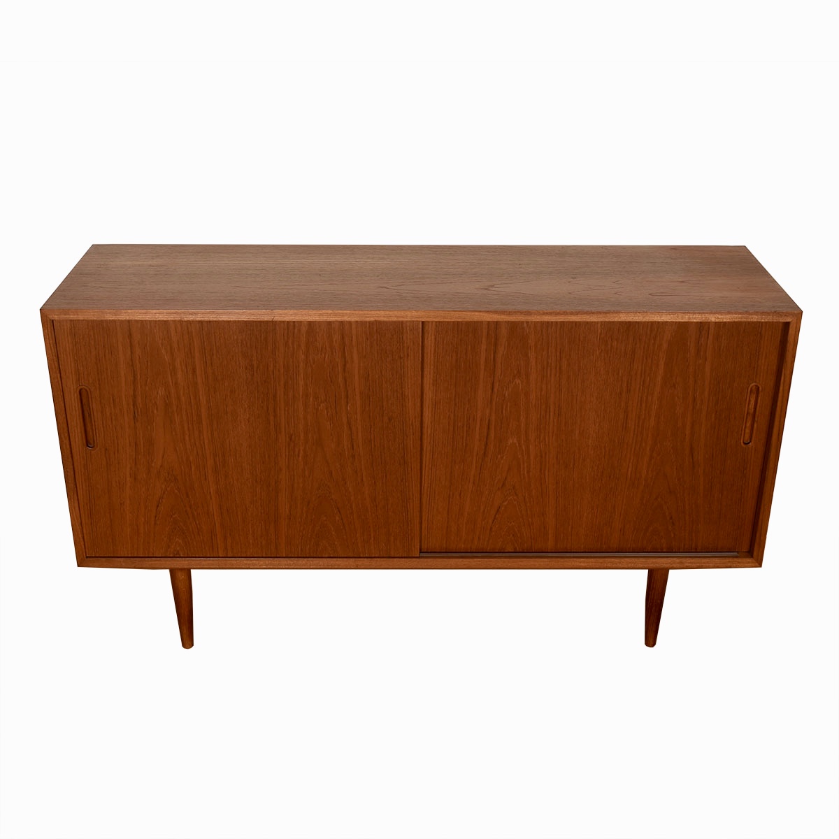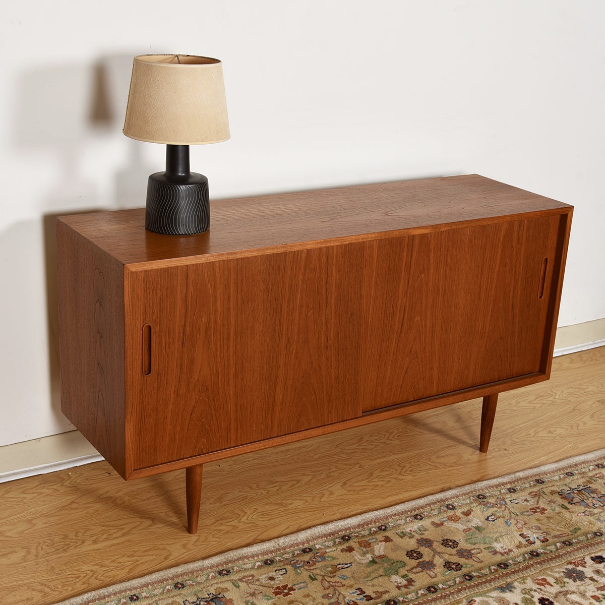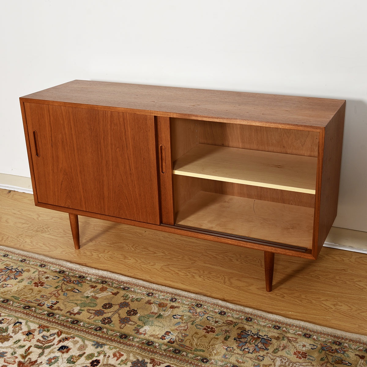 The sliding doors on this compact cabinet from Denmark, make it an especially good choice for tight spaces where doors that open out may be difficult. Perfect as a media cabinet, used in an entryway (even better with a mirror above it), and could also be used as a sideboard.
