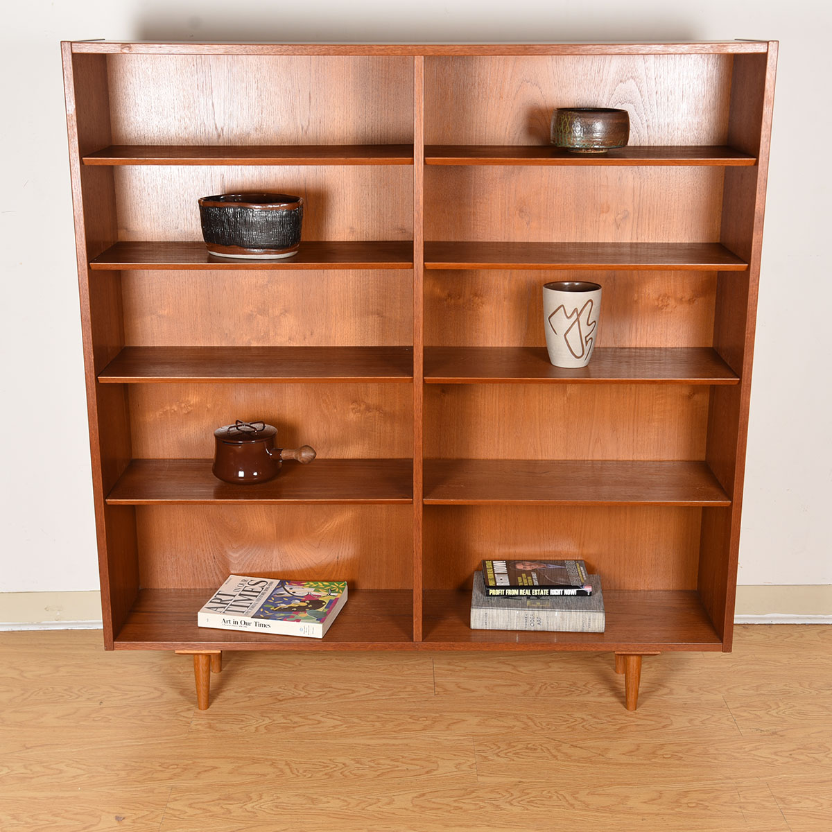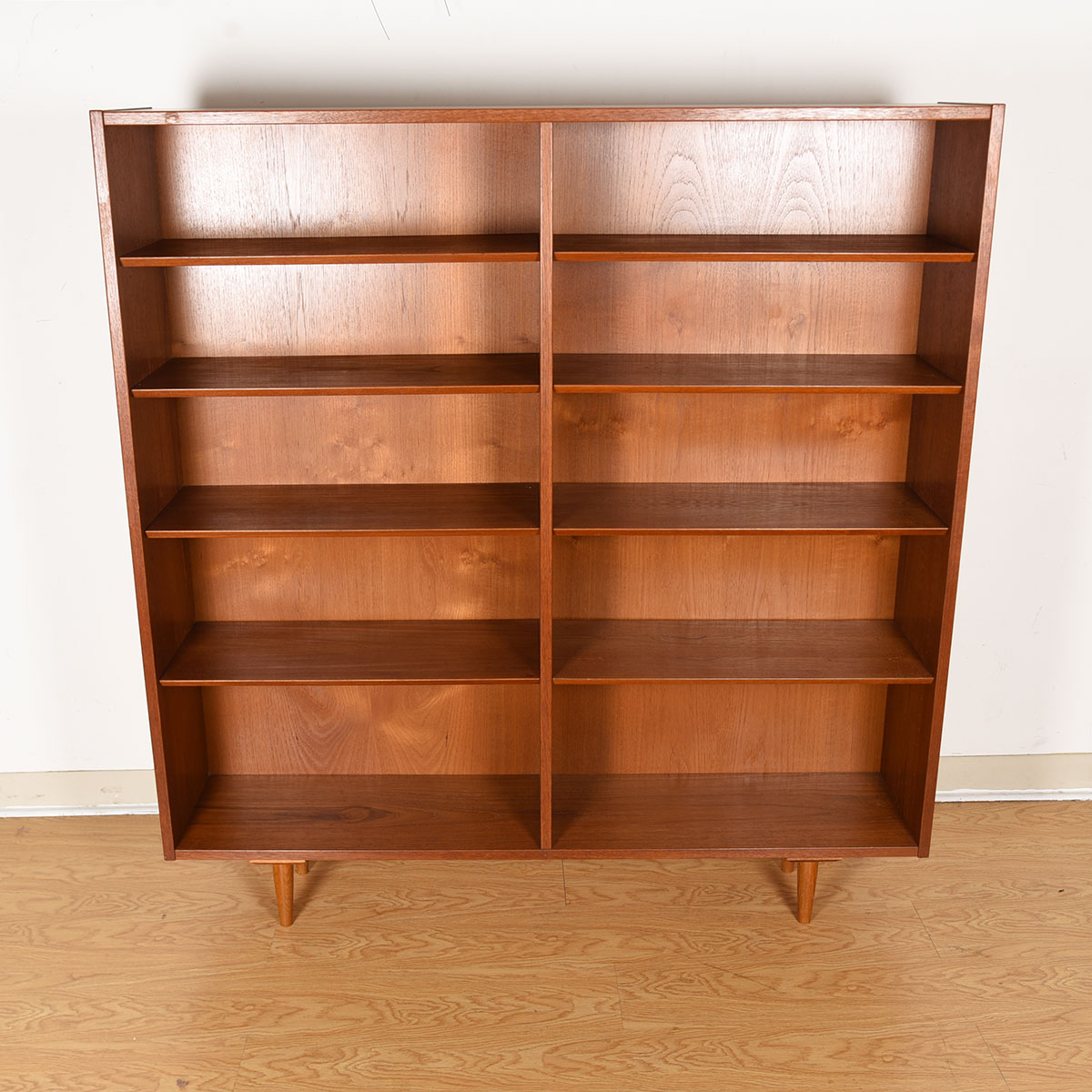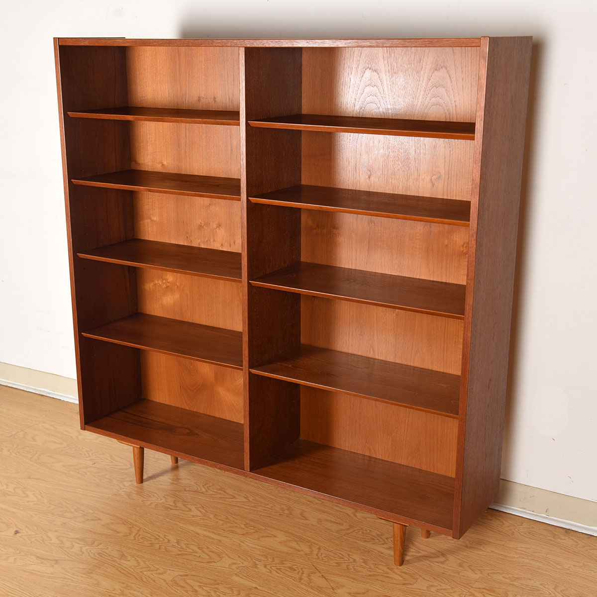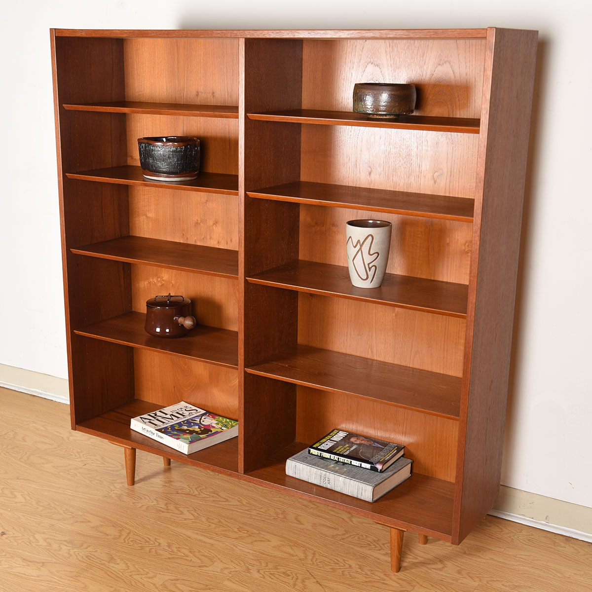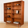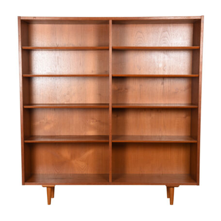 This Danish Modern bookcase. Fabricated of teak, the rich graining and tones of the piece make a gorgeous backdrop to any display. The double bookcase has adjustable beveled shelves throughout. The overall styling is straightforward putting the emphasis on its contents rather than the furniture.
