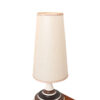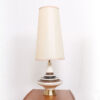 This pair of fantastical table lamps from the ’60s will take your retro décor to the next level. The pottery base has a “genie” bottle form. It is white with stripes of brown and black at the base of the neck of the “bottle”.