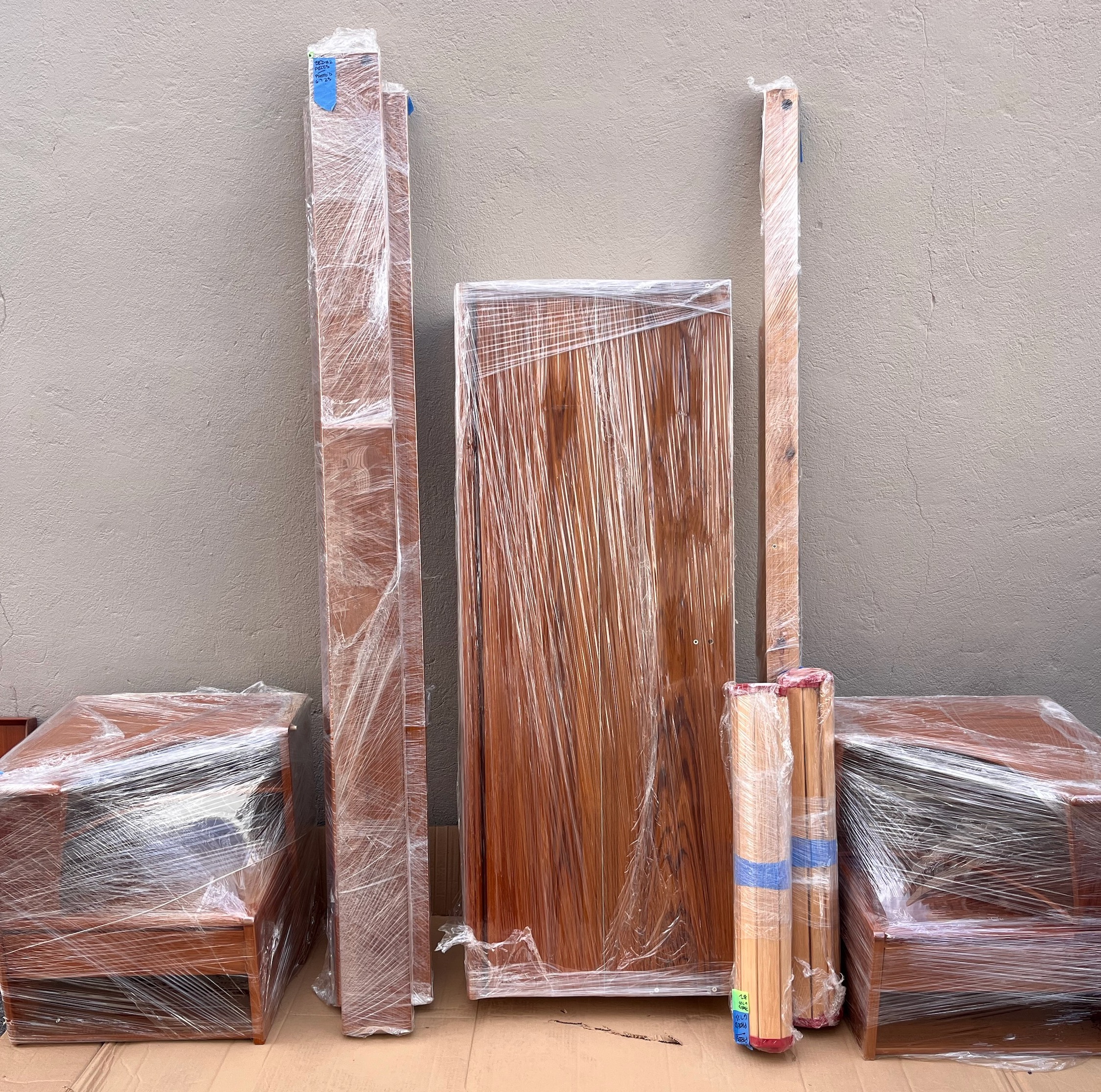 - Queen Teak Platform Bed with a drop-down storage cubby built into the headboard