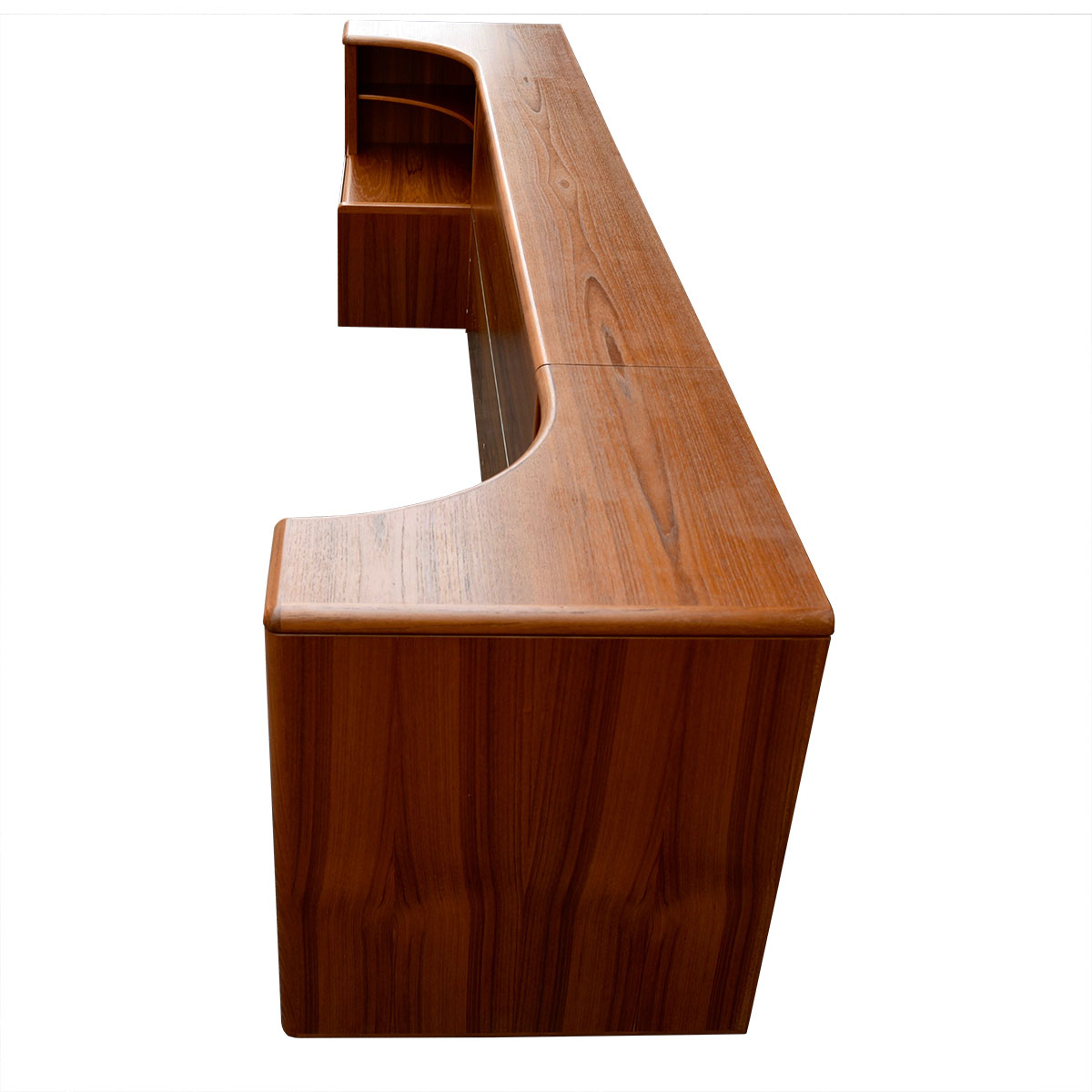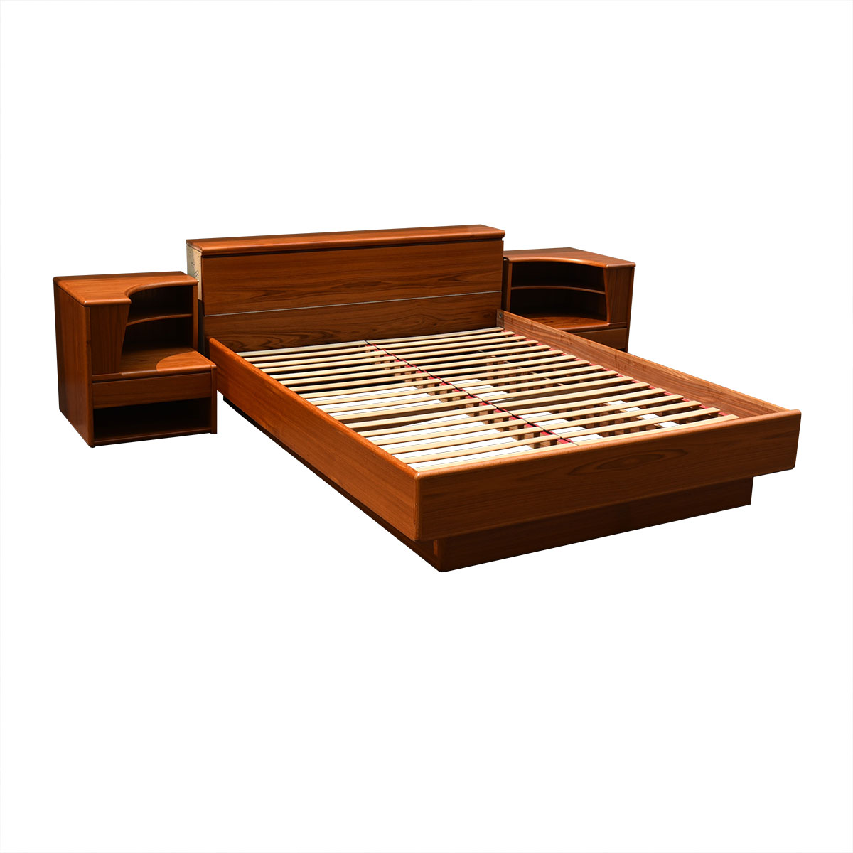 Curvaceous Danish Teak Queen Bed w: Attached Nightstands + Headboard Storage