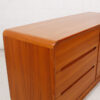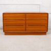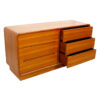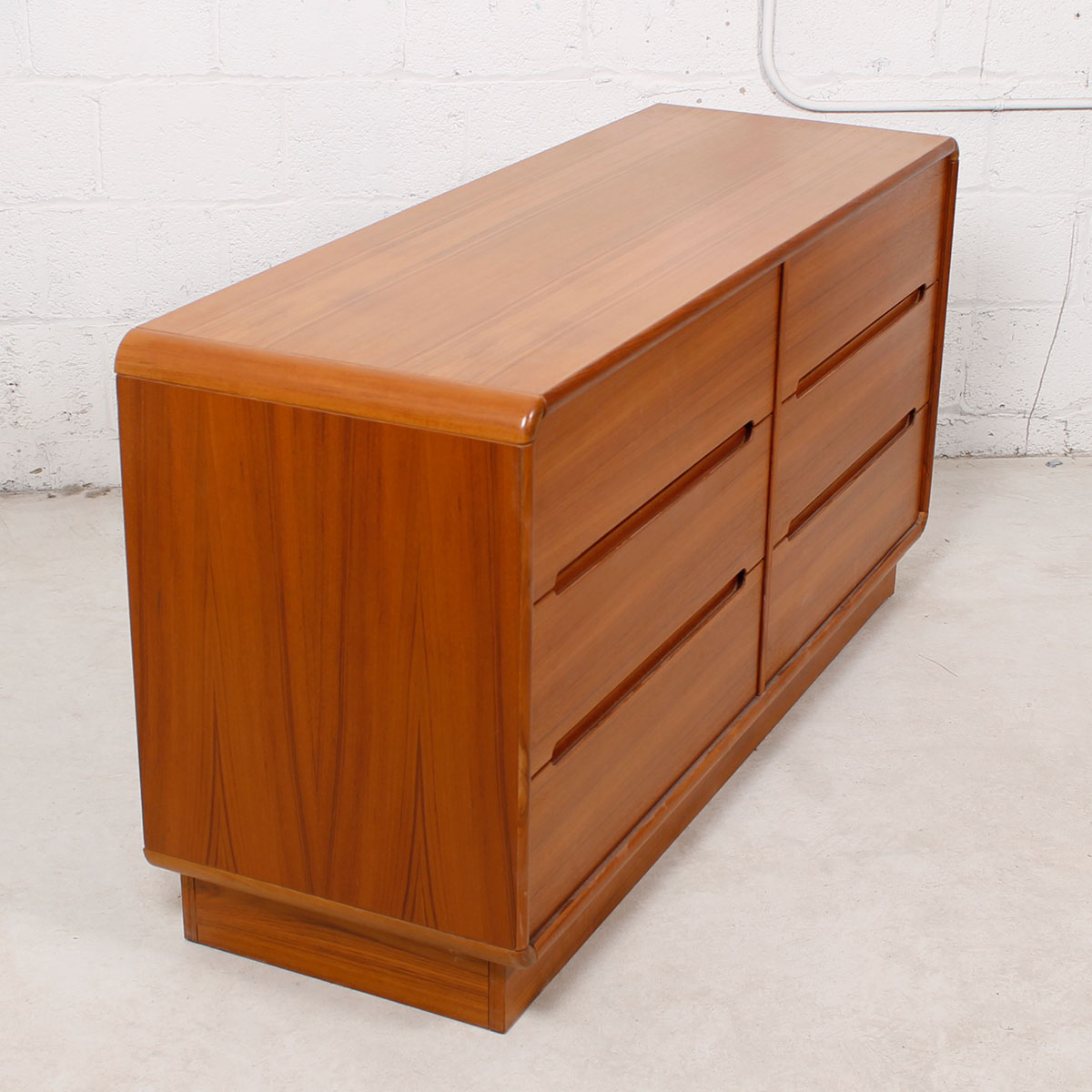 Though compact in size, this sexy teak dresser with great lines is big on storage as well as presence. It features six good-sized drawers defined on the flat front by rounded horizontal indentations which serve as pulls. The corners are also rounded as is the molding surrounding the frame of the case. Besides using it as a dresser, this piece could also work well as a media cabinet or in an office, due to it size and configuration. It is finished on the back making it ideal for use in the middle of a room.