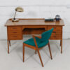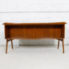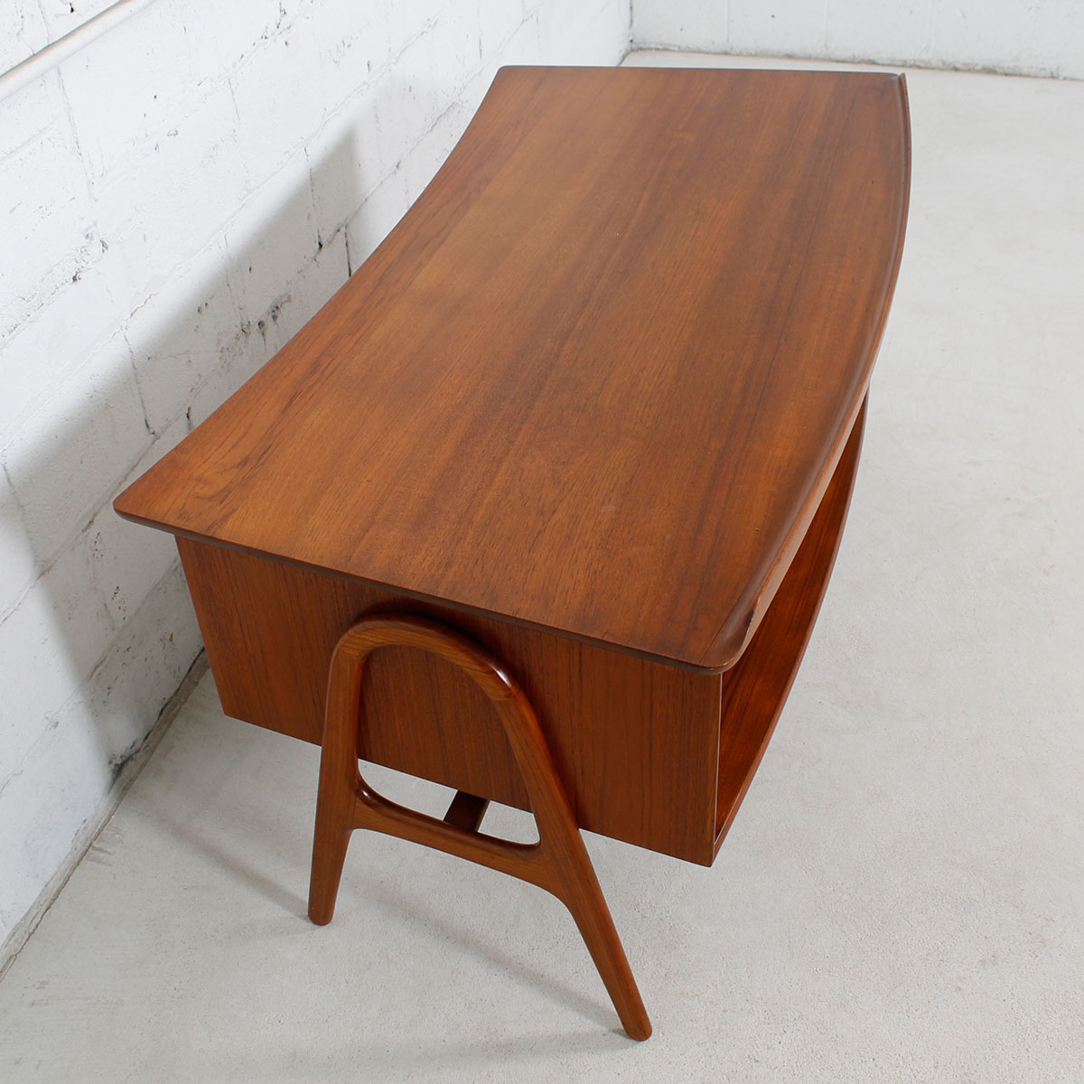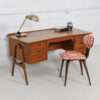 Work becomes fun when you can sit at a desk like this sexy thing. Meant to be placed in the middle of a room as an executive desk, the teak desk has a bookshelf on one side. But what makes it truly special are its curves – the desk top is curved, so that the surface gently fans out in front of you and has a raised edge.