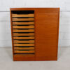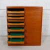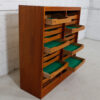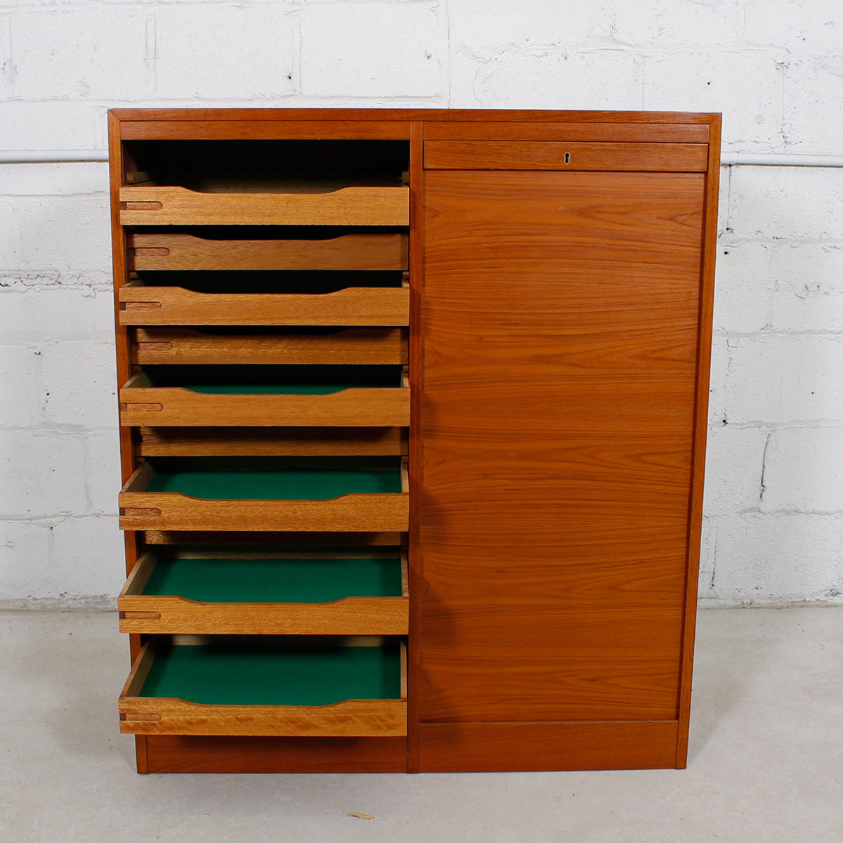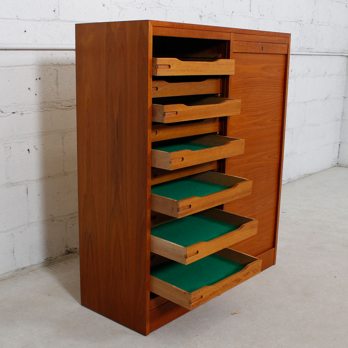 This tall Danish Modern cabinet is perfect for storage of small precious items such as jewelry. Made of teak it has vertical tambour doors that lock. Inside, there are two bays each with eleven shallow drawers that pull out for easy accessibility. The drawers are lined with felt to protect your valuables. A good-looking and function piece.
