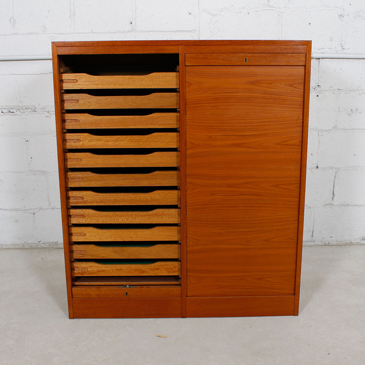 To arrange purchase or for more information about the Danish Double Teak Tall Locking Tambour Door Cabinet w / Drawers please call us at 202.882.1648 or email us at info@modernmobler.com