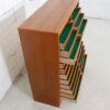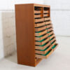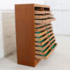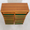 This tall Danish Modern cabinet is perfect for storage of small precious items such as jewelry. Made of teak it has vertical tambour doors that lock. Inside, there are two bays each with eleven shallow drawers that pull out for easy accessibility. The drawers are lined with felt to protect your valuables. A good-looking and function piece.