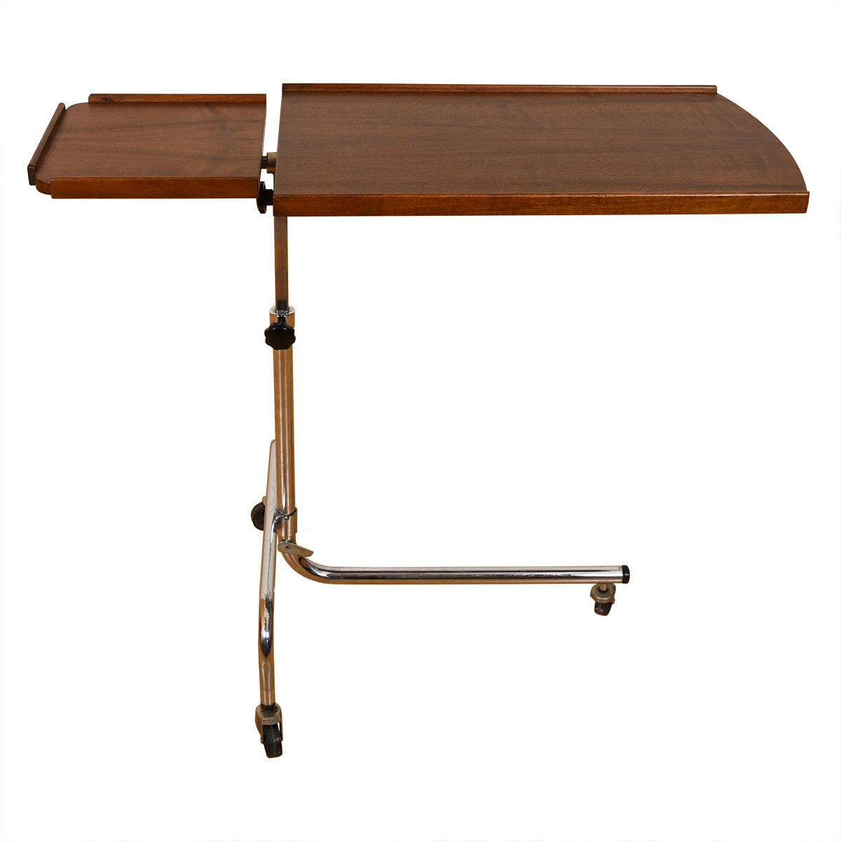 A separate, smaller surface is stationary to hold a mug or other items. It is on wheels so it can be moved around easily. Beautiful in walnut, this item will increase the functionality of your space.