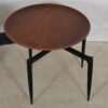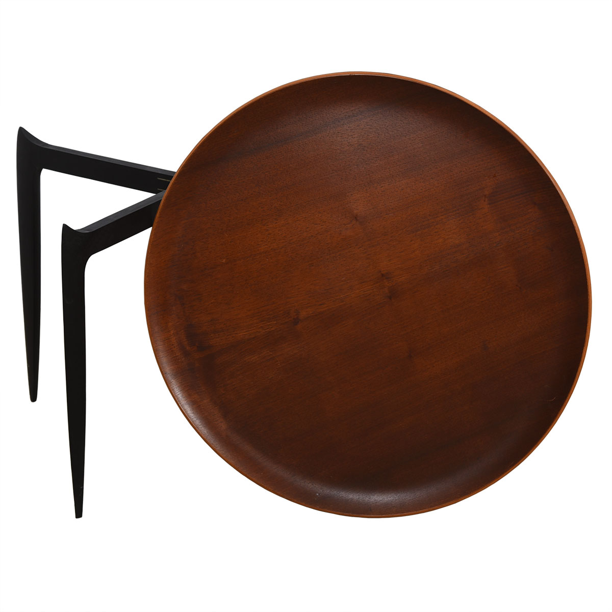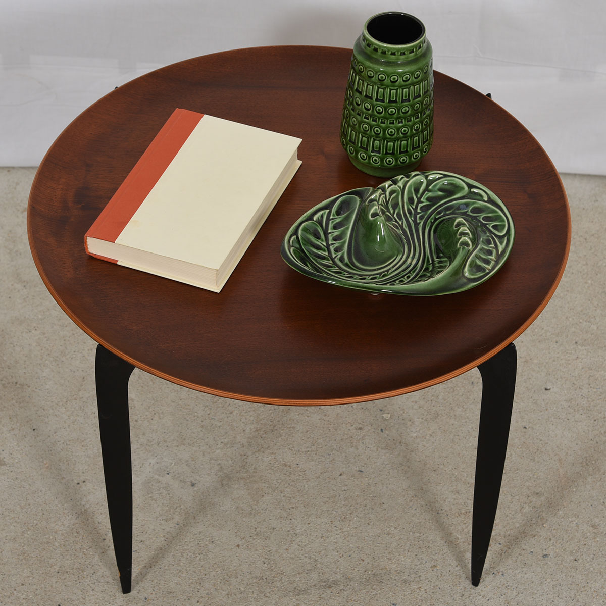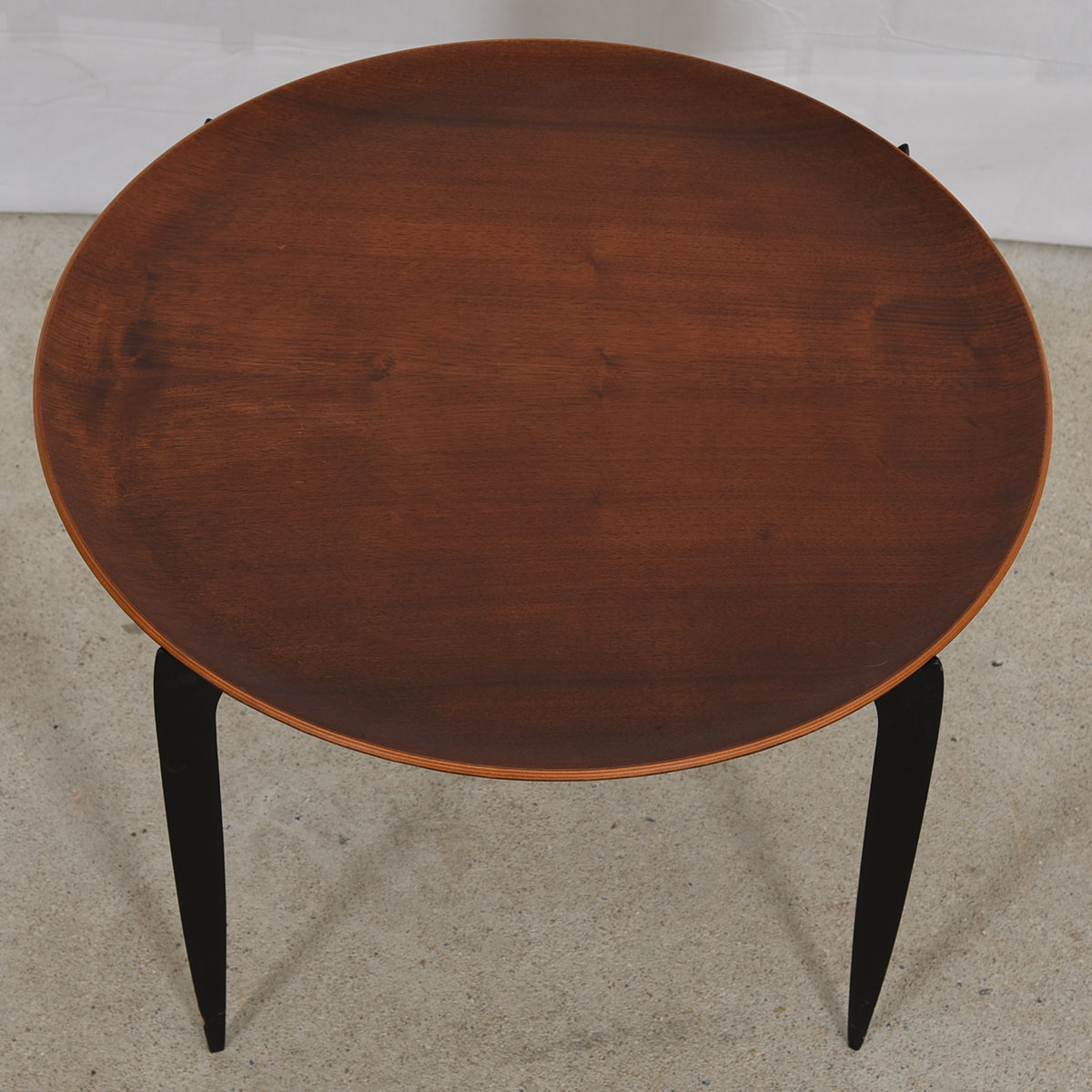 We are pleased to offer this practical and beautiful table by Engholm & Willumsen for Fritz Hansen. A large round tray of teak perches on spider-like ebonized legs.