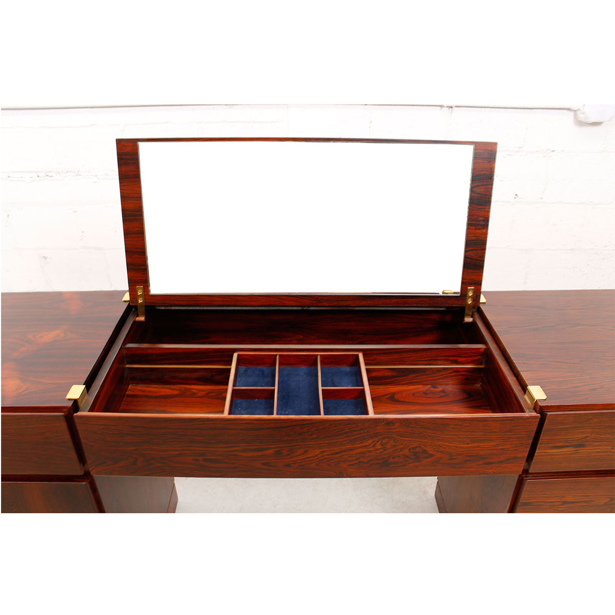 Elegant rosewood vanity designed by Arne Wahl Iversen for Vinde Møbelfabrik, Denmark. 1960s. Table Flips Open to Reveal a Vanity Mirrror & Storage Space. Comes with sliding / removable jewelry storage tray. Rest gently on top of other Matching Vinde pieces.
