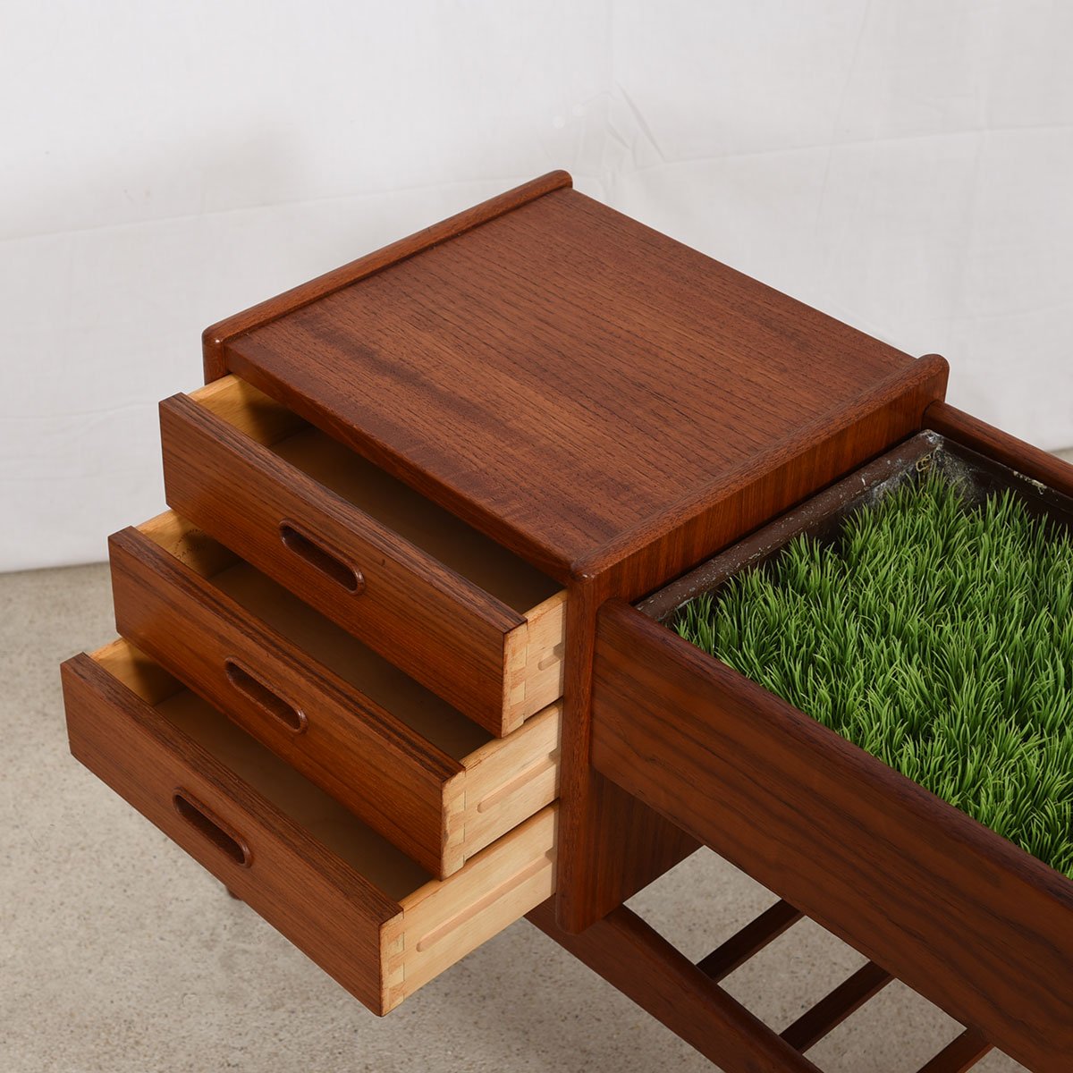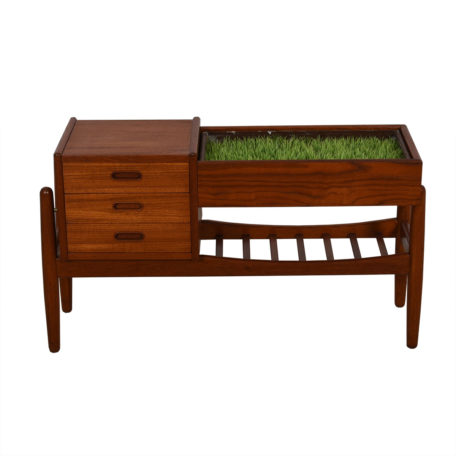 Early 1960s console tables in teak with three small drawers, a planter box and lower magazine shelf designed by Arne Wahl Iversen for Vinde Mobelfabrik, Denmark.