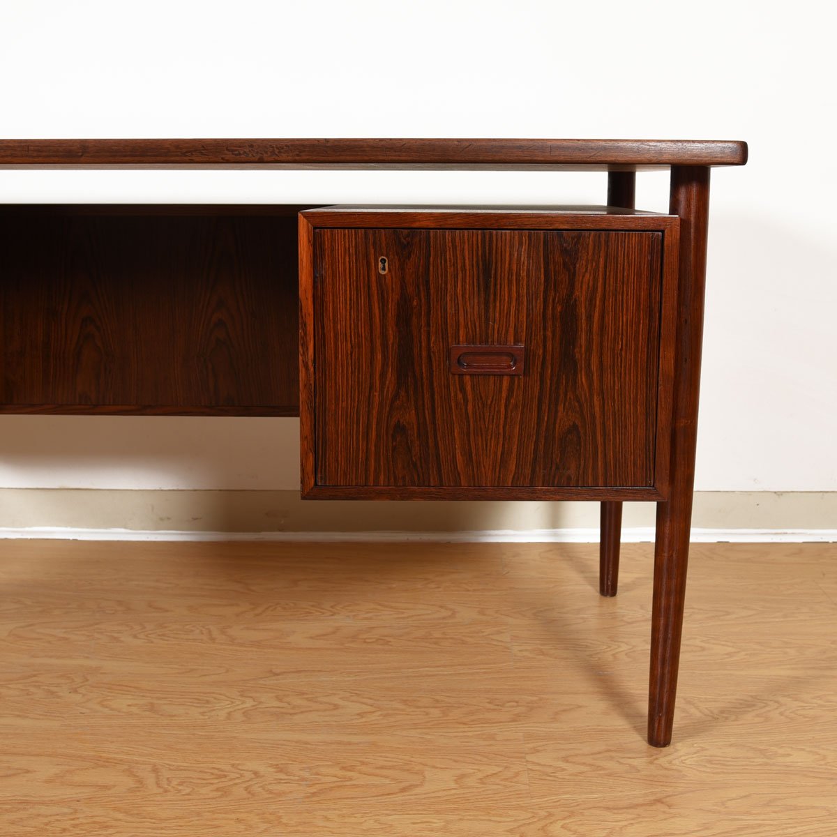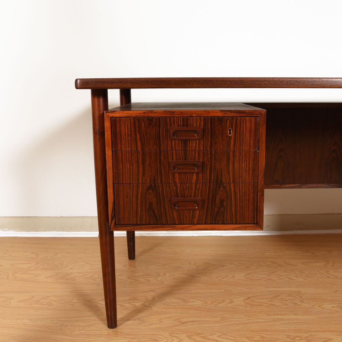 Stunning Danish Modern desk with a floating top in rosewood. Three shallow drawers flank the kneehole on the left, while a large file drawer is on the right.