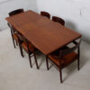 Truly one of the most beautiful tables we’ve ever had! This Danish Modern teak table attributed to Johannes Andersen, for Uldem Møbelfabrik, dates to the mid- to late- ’50s and has the craftsmanship and attention to detail to prove it. To begin with, the grain on the top of the table is matched, and when the two leaves are in, there is an exciting explosion of the teak grain right in the middle.